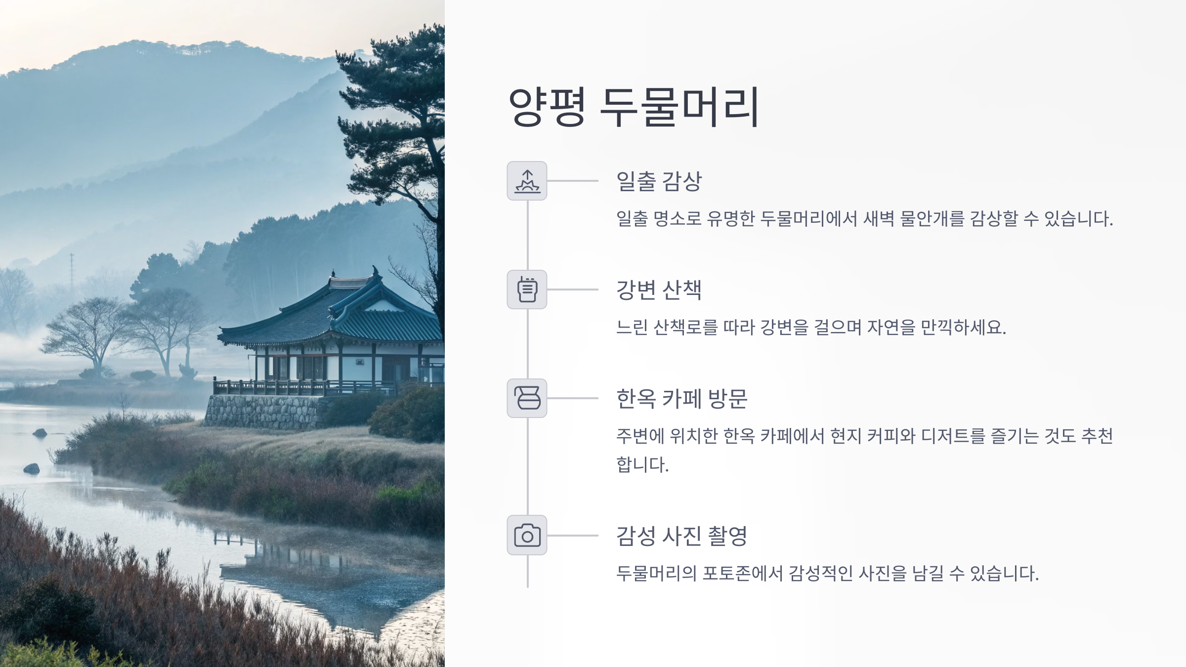 | 양평 두물머리를 처음 방문한다면 일출부터 여정을 시작해보세요. 일출 명소로 유명한 두물머리에서 새벽 물안개를 감상할 수 있습니다. 이후 느린 산책로를 따라 강변을 걸으며 자연을 만끽하세요. 주변에 위치한 한옥 카페에서 현지 커피와 디저트를 즐기는 것도 추천합니다. 마지막으로 두물머리의 포토존에서 감성적인 사진을 남길 수 있습니다. |