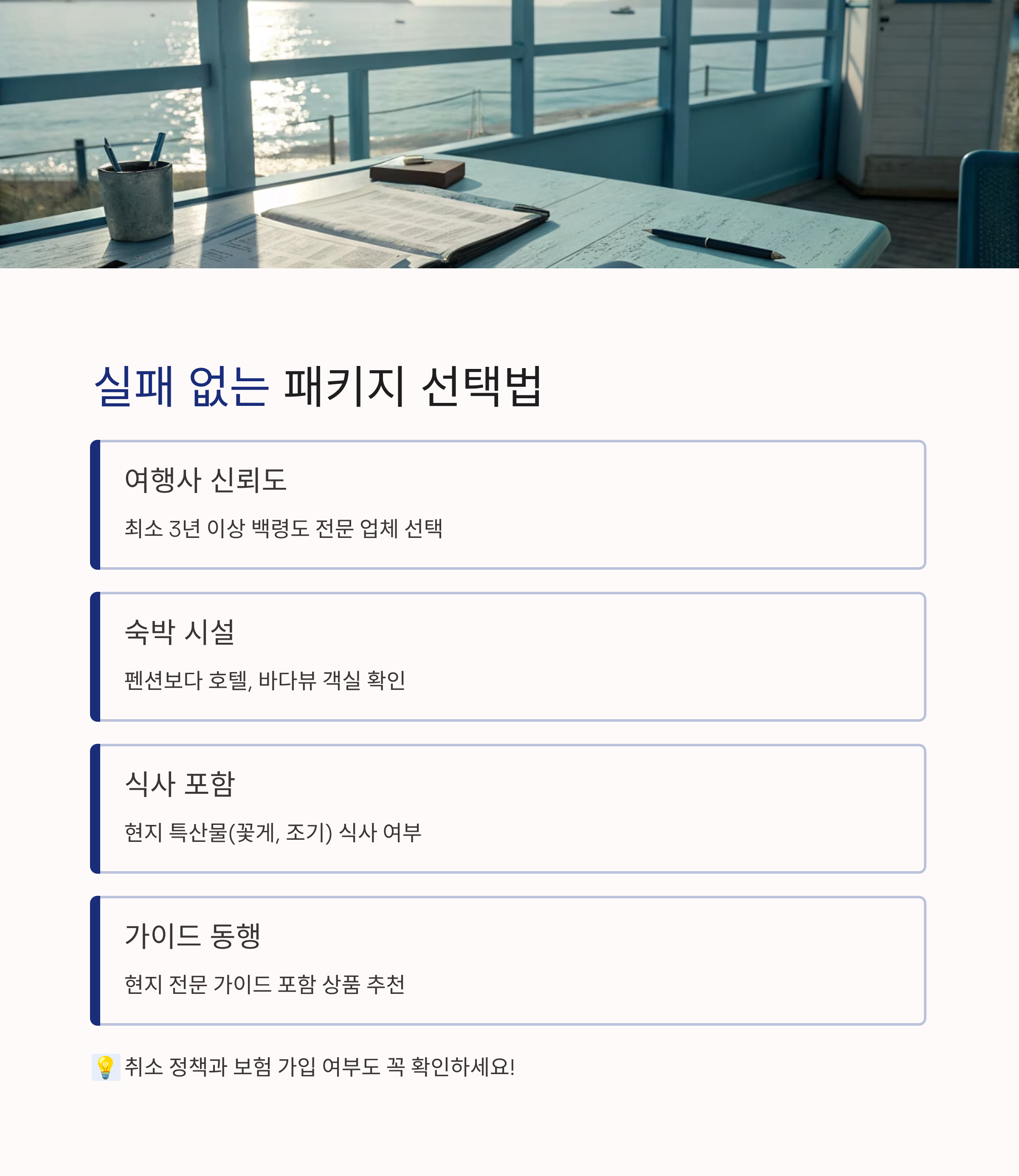 비슷해 보이는 패키지 상품도 자세히 들여다보면 차이가 있습니다. 예약 전 아래 4가지를 반드시 확인하세요.