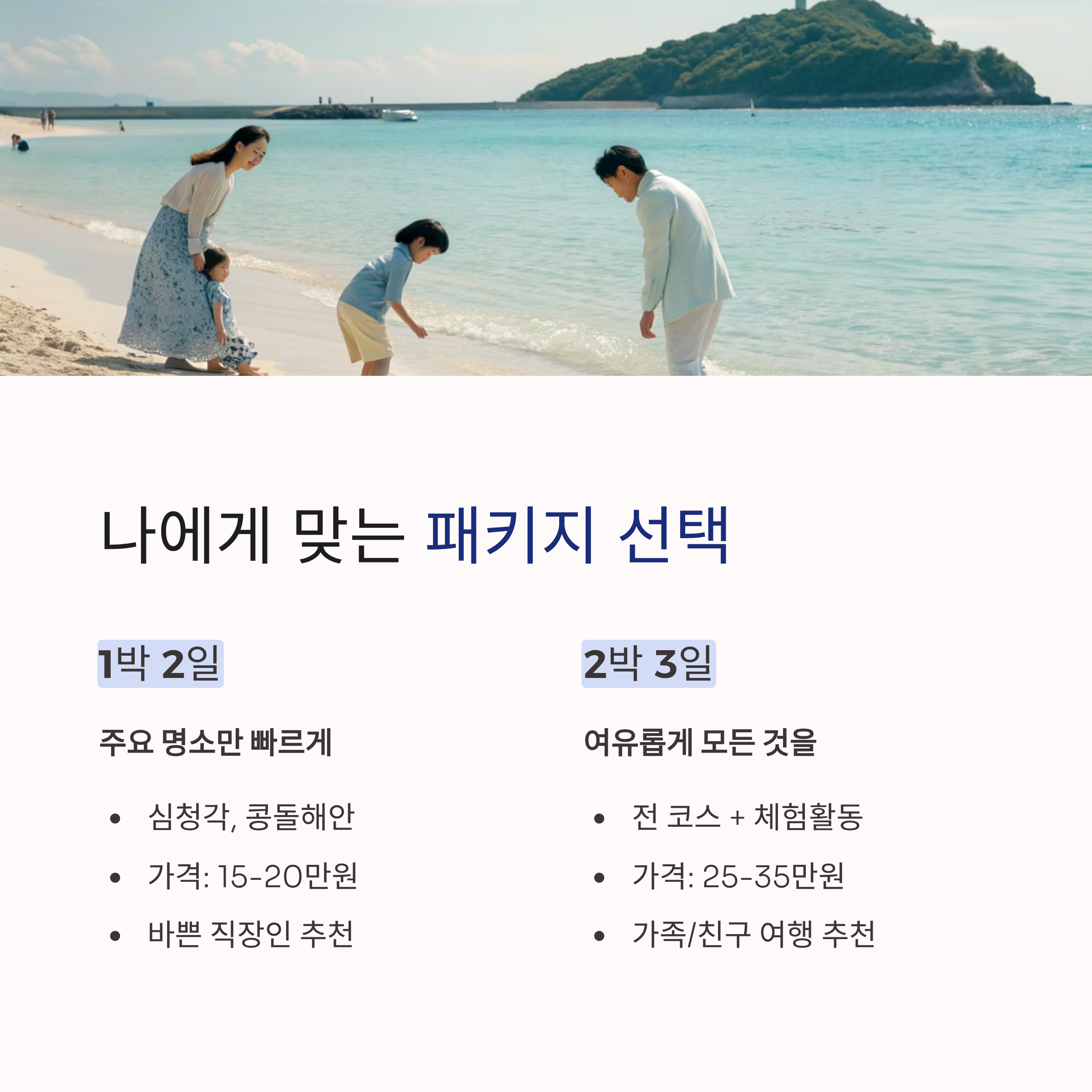 2박 3일 패키지: 좀 더 여유롭게 섬을 즐기고 싶은 분들에게 추천합니다. 1박 2일 코스에 더해 숨겨진 명소를 방문하거나 자유 시간을 가질 수 있습니다. 인근 섬인 대청도를 함께 둘러보는 연계 상품도 있습니다.