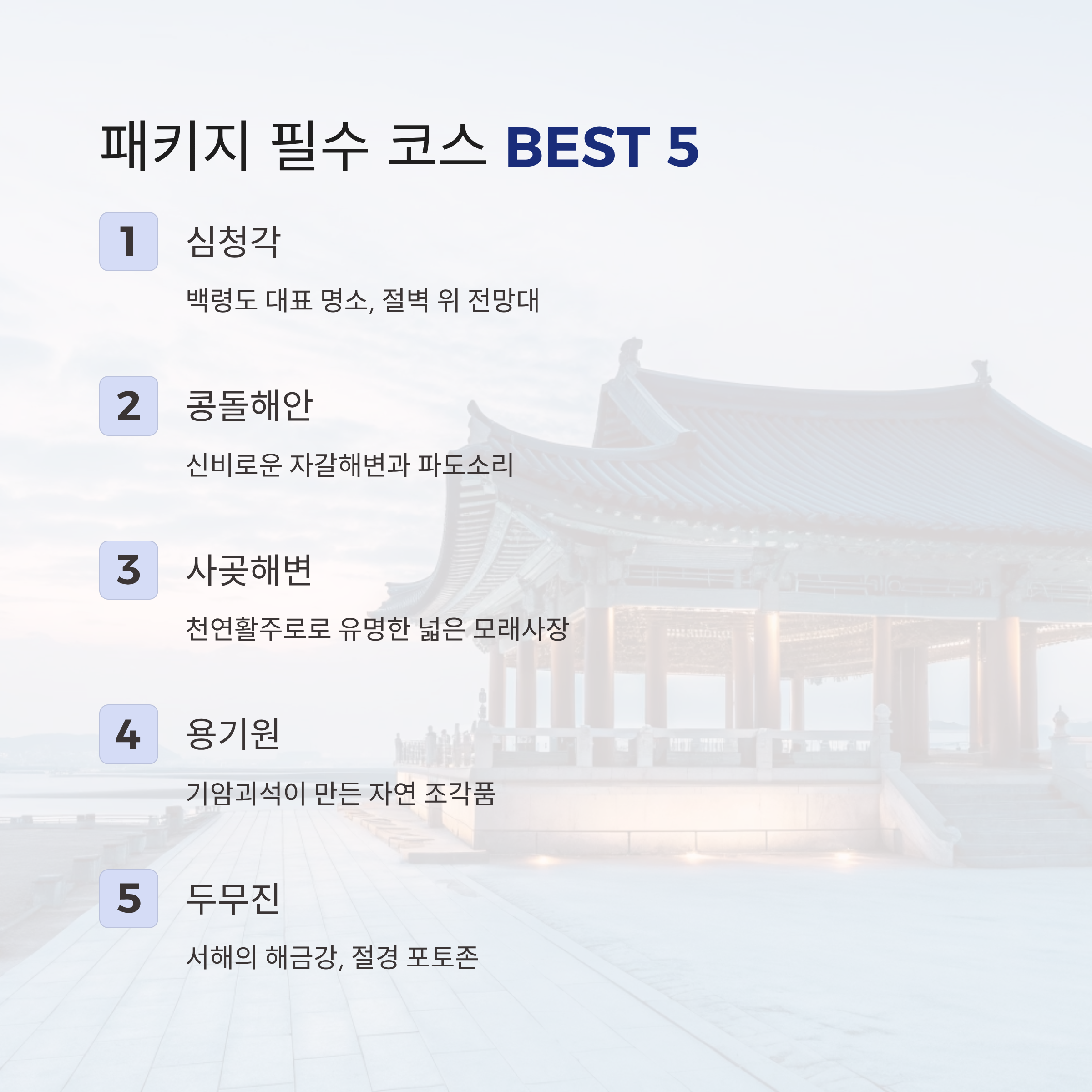 어떤 패키지를 선택하든 아래의 5곳은 거의 빠짐없이 포함됩니다. 백령도의 매력을 오롯이 느낄 수 있는 필수 코스입니다.