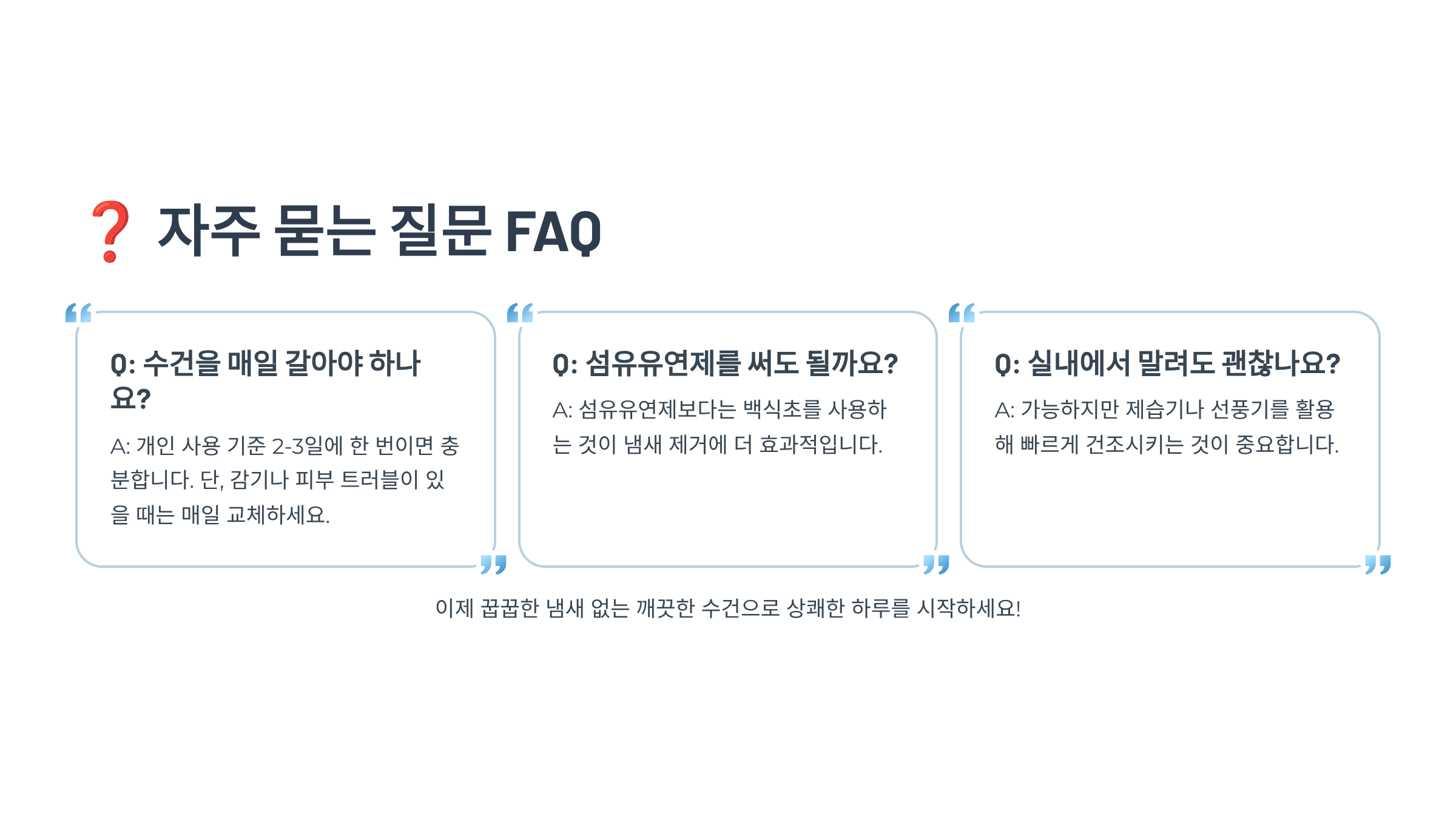 | 일상 관리 | 잦은 냄새 발생, 수건 수명 단축 | 사용 후 바로 말리기, 단독 세탁, 세제 정량, 충분한 간격 건조, 주기적 교체 | 세균 번식 예방, 흡수력 유지, 수건 수명 연장 |