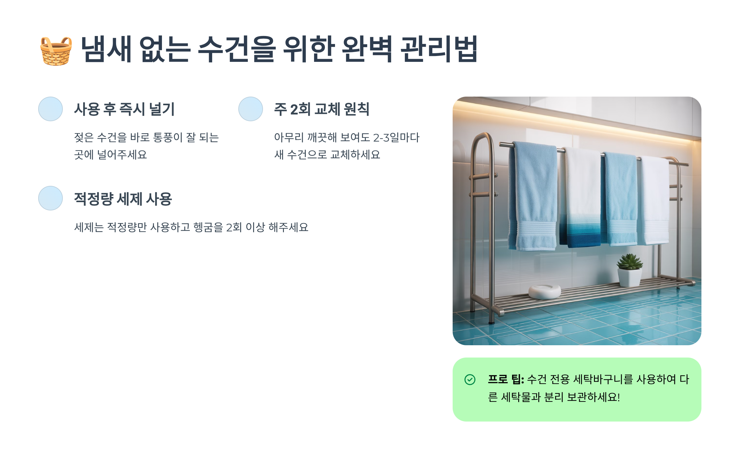 | 일상 관리 | 잦은 냄새 발생, 수건 수명 단축 | 사용 후 바로 말리기, 단독 세탁, 세제 정량, 충분한 간격 건조, 주기적 교체 | 세균 번식 예방, 흡수력 유지, 수건 수명 연장 |