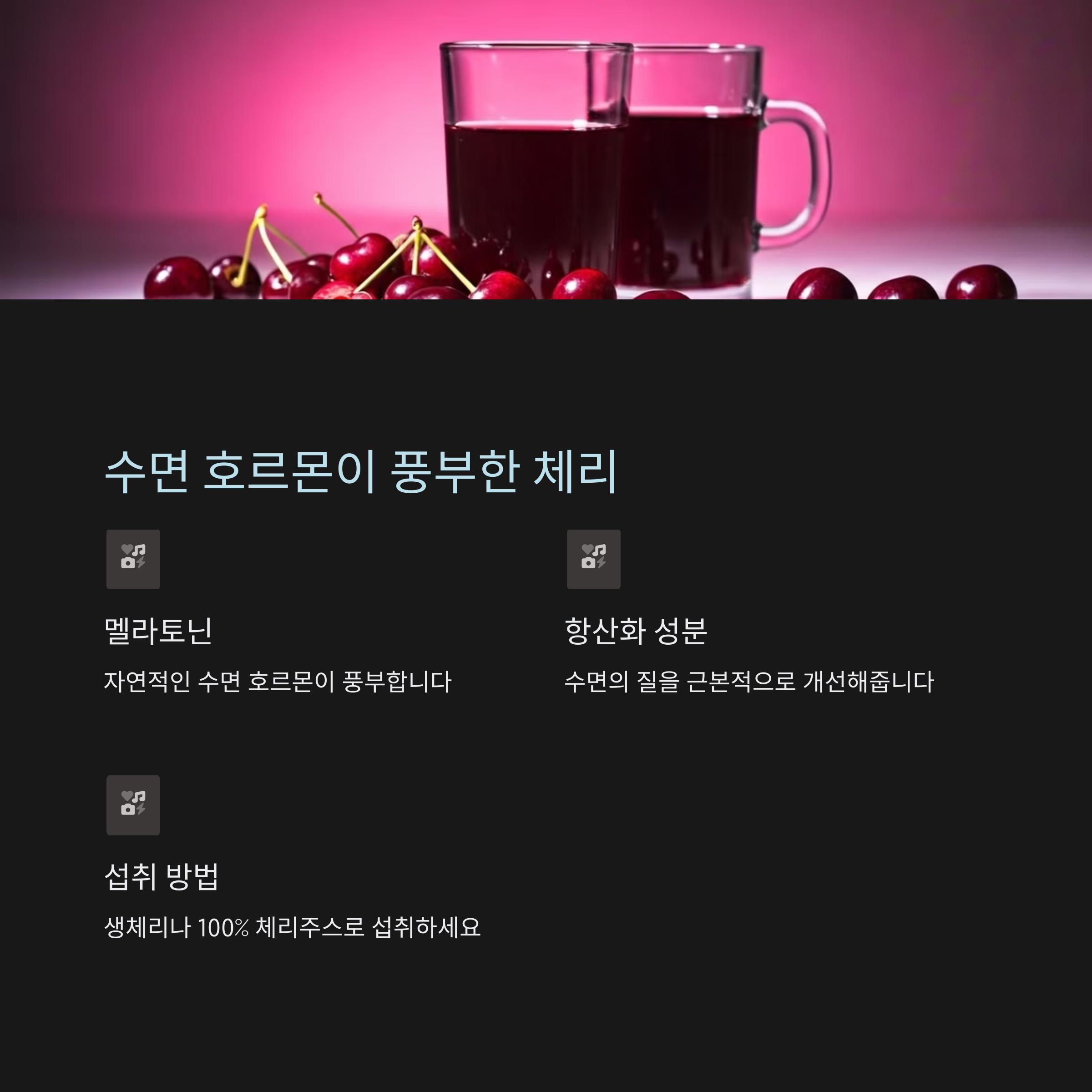 | 각성 효과로 수면 방해 | 마그네슘, 칼륨으로 근육 이완 도움 | 멜라토닌이 수면 주기 조절 |