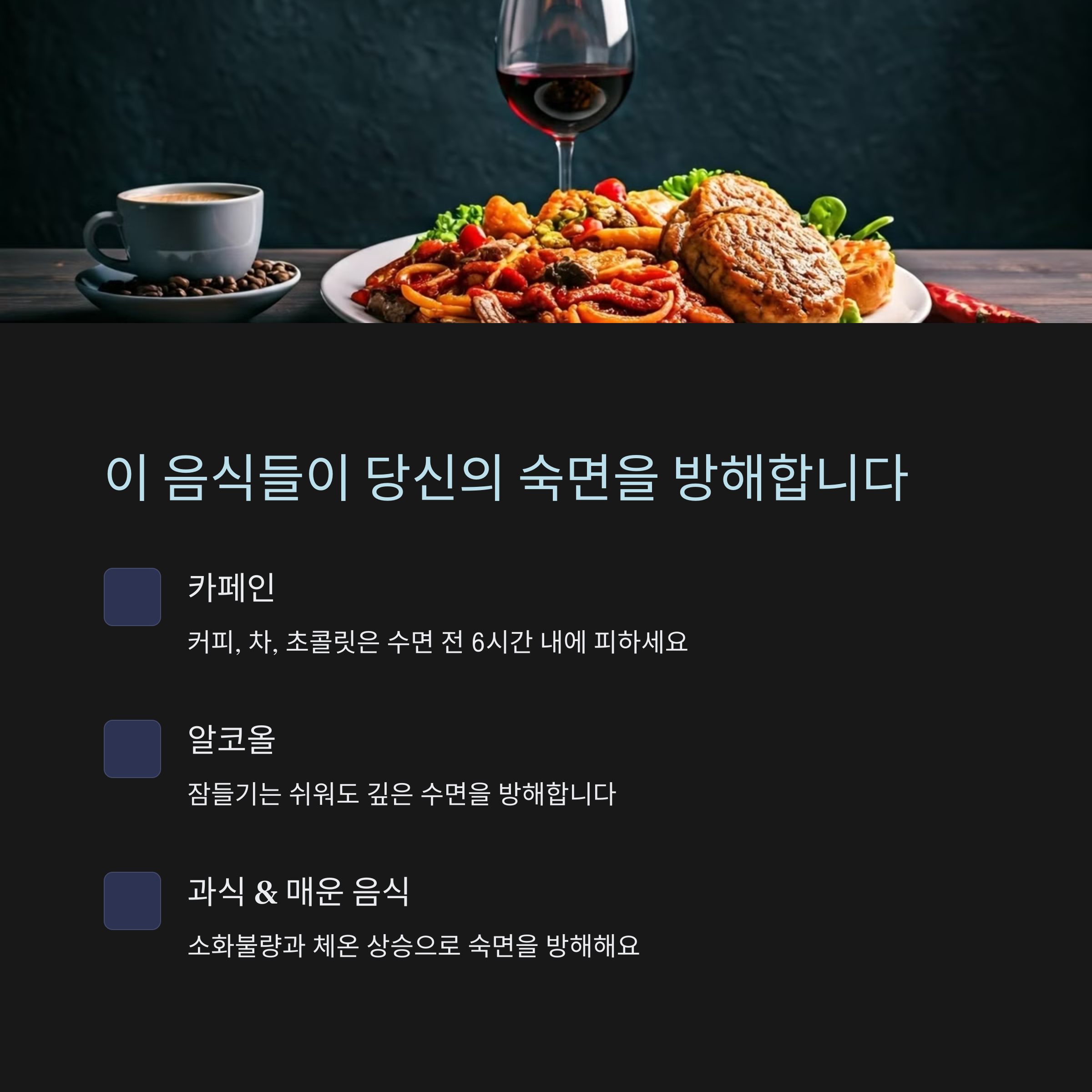 | 숙면을 방해하는 음식 | 카페인, 알콜, 과식, 매운 음식 등 |
