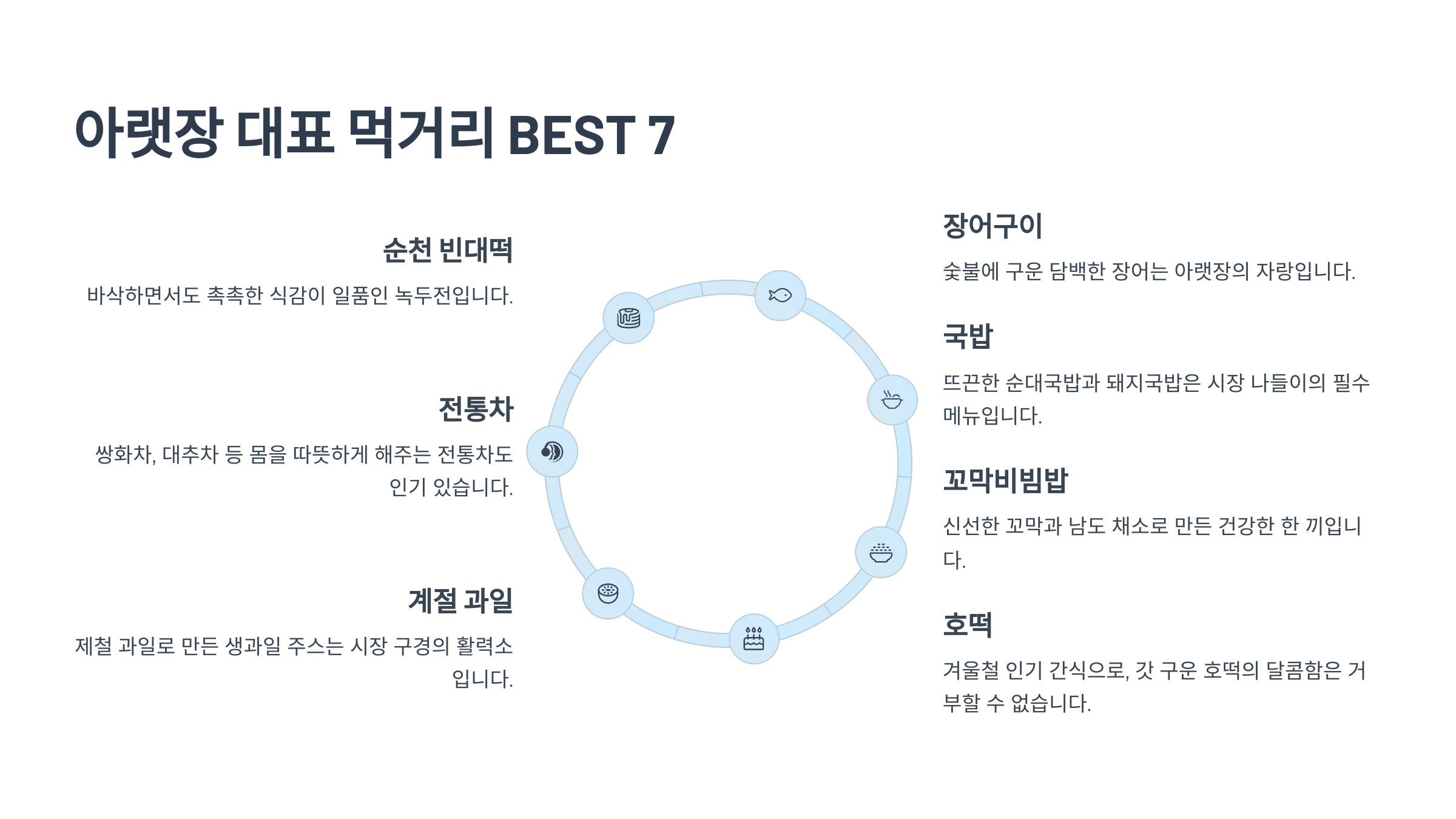 순천 아랫장은 남도의 인심과 전통, 그리고 다양한 먹거리가 살아 숨 쉬는 곳입니다. 오일장 특유의 활기, 싱싱한 농수산물, 그리고 시장표 별미를 한 번에 즐길 수 있는 순천 아랫장. 가족, 친구, 연인과 함께 남도의 맛과 정을 느끼는 특별한 시장 나들이를 떠나보세요!
