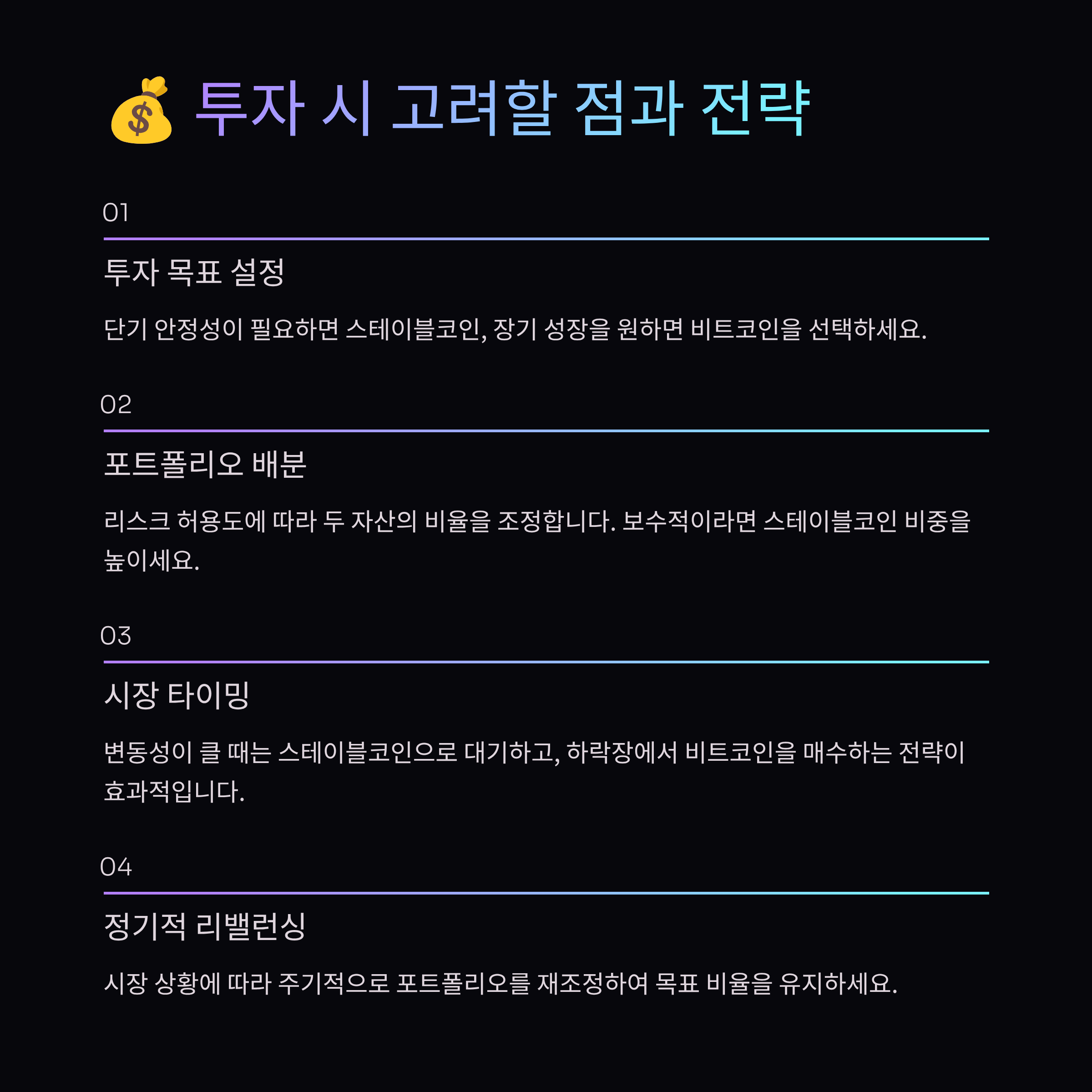 장기적 자산 성장을 목표로 한다면 비트코인 중심, 단기 안정성 확보라면 스테이블코인을 병행하는 것이 좋습니다.