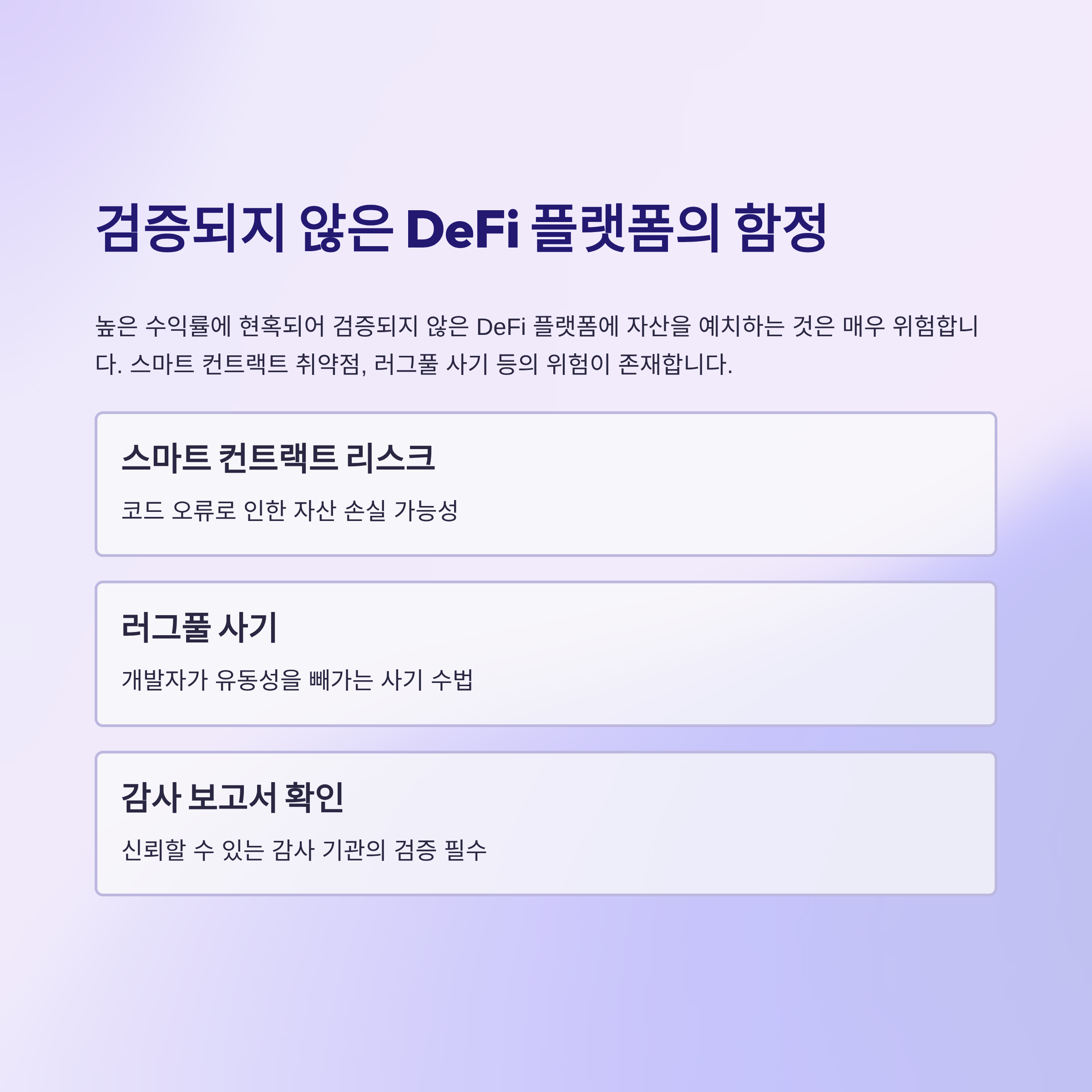| DeFi 플랫폼 리스크 | 스마트 컨트랙트 버그, 러그 풀, 해킹 등으로 자산 손실 |