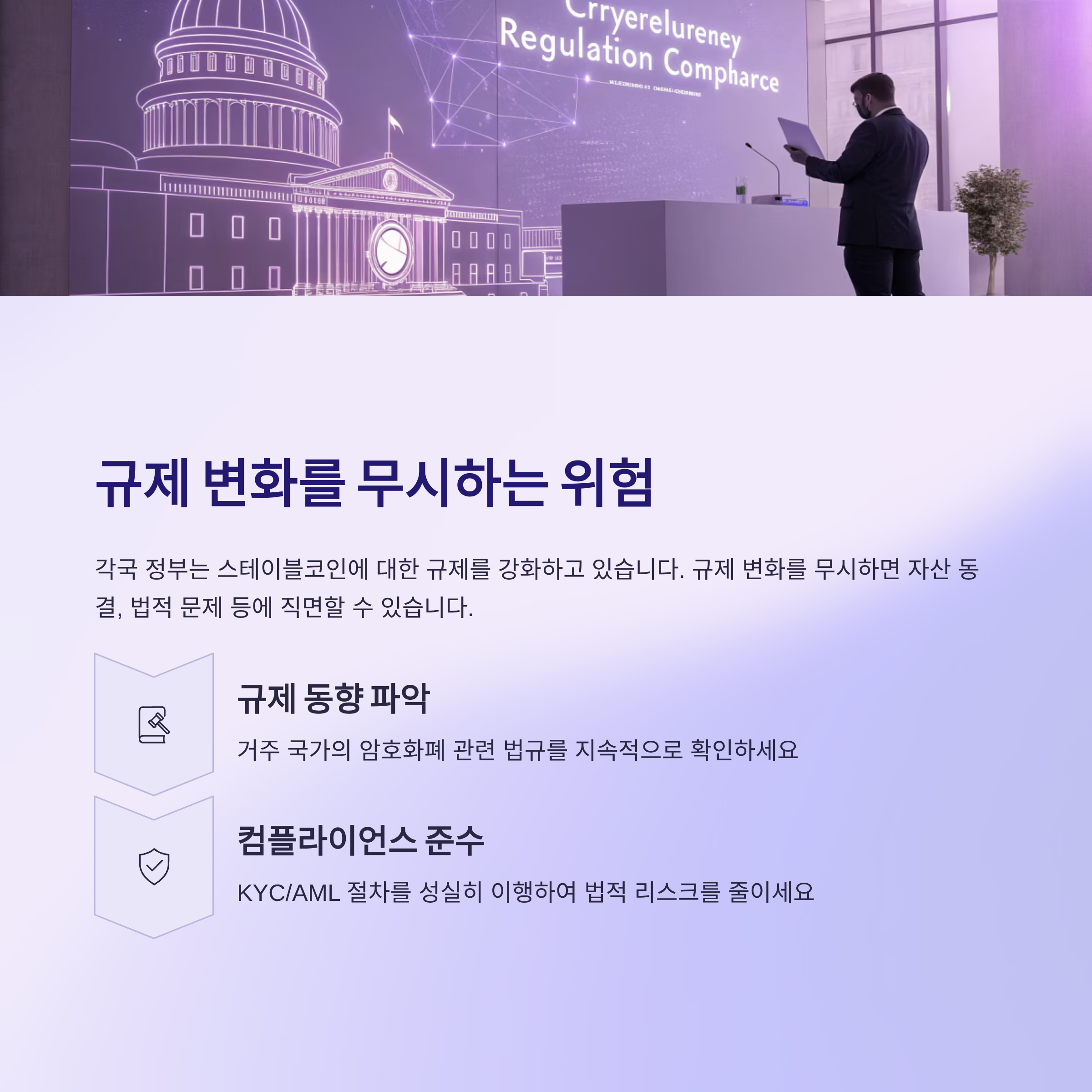 | 5. 규제 변화/컴플라이언스 무시 | 규제 강화로 거래 제한/계정 동결, 법적 불이익 발생 | 규제 동향 주시, AML/KYC 준수, 규제 친화적 스테이블코인 선택, 세금 관련 법규 이해 | 법적/금융적 안정성 확보 |