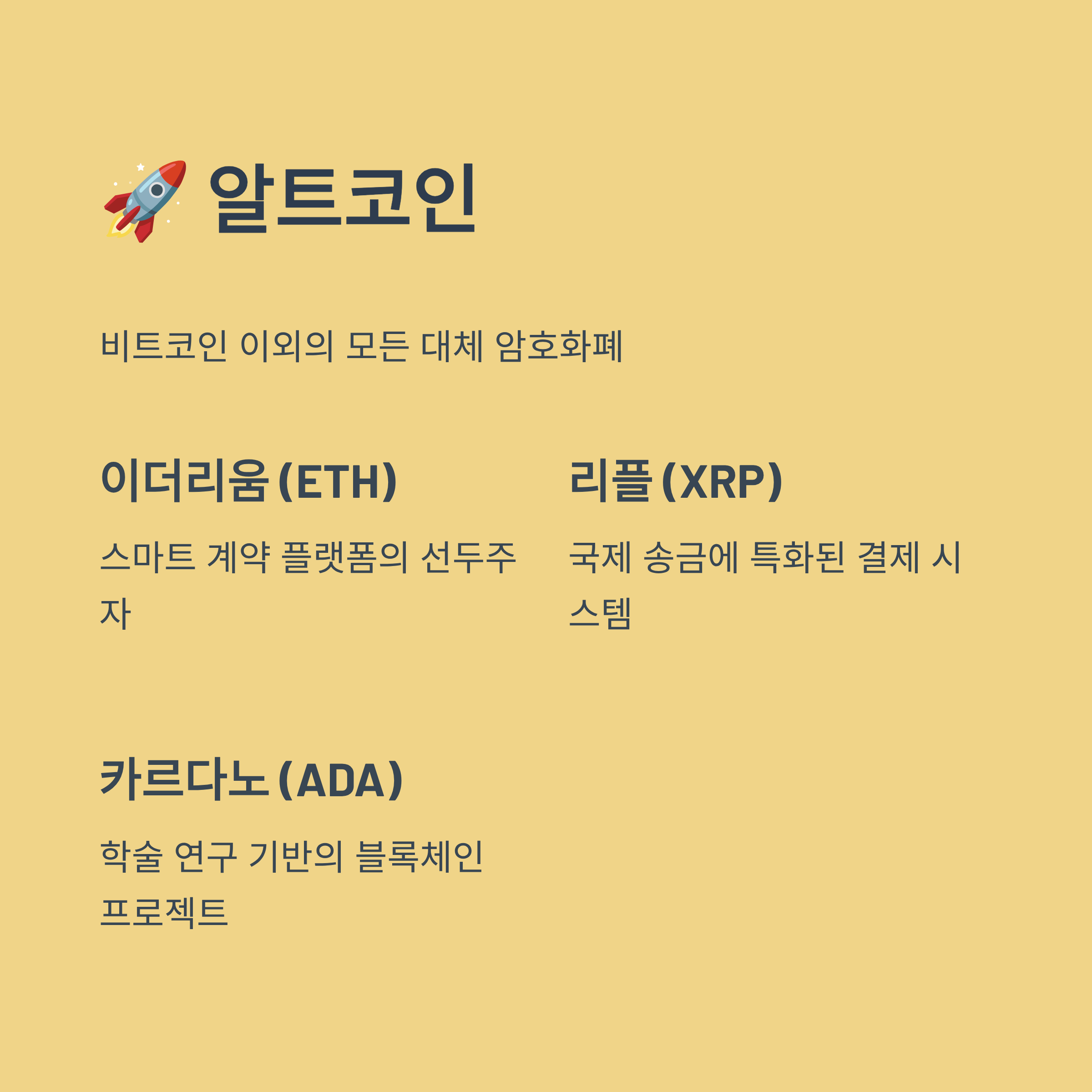 - 주요 예시: 이더리움(ETH), 리플(XRP), 카르다노(ADA), 솔라나(SOL), 폴카닷(DOT) 등 수천 가지의 알트코인이 존재합니다.