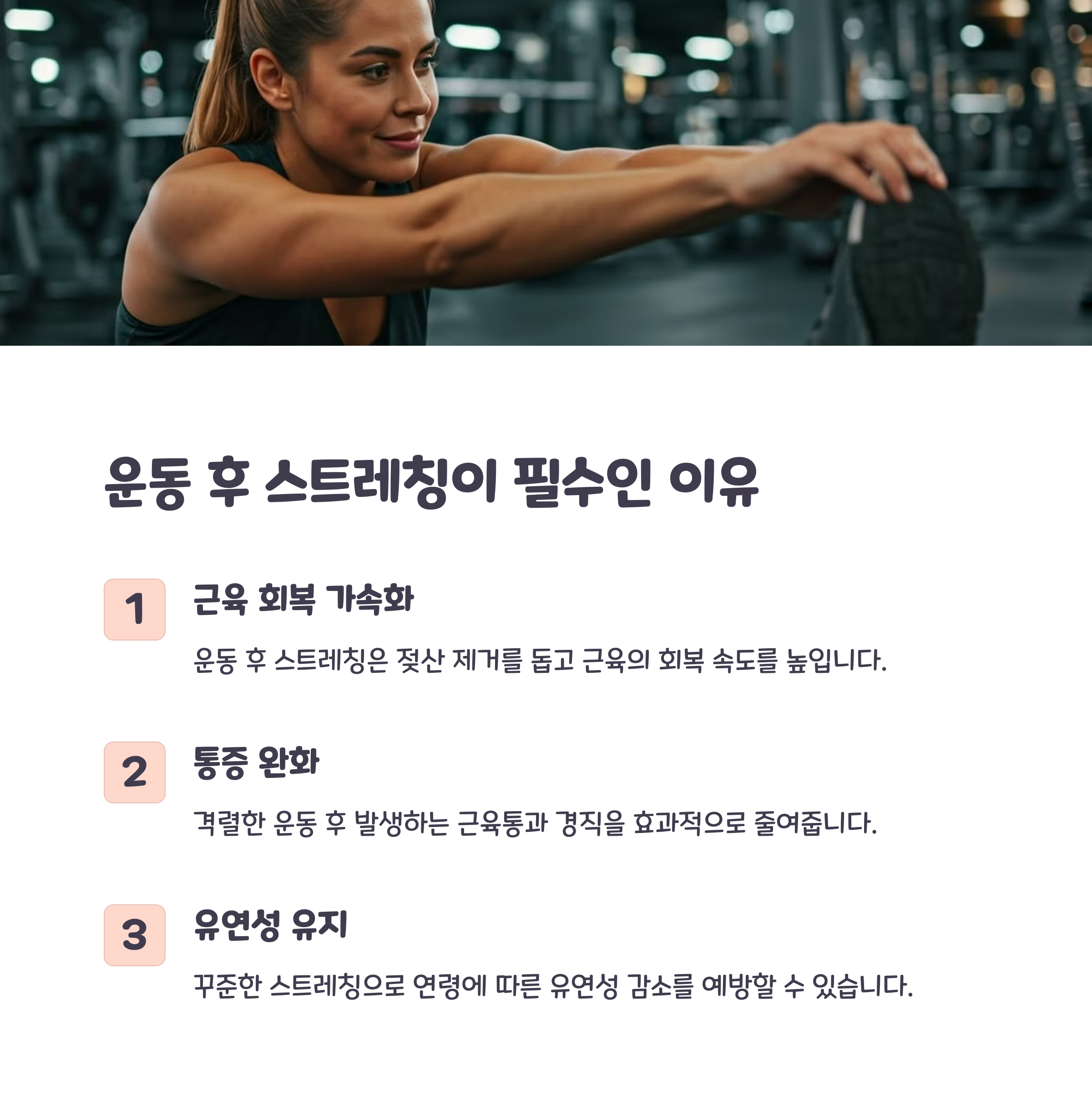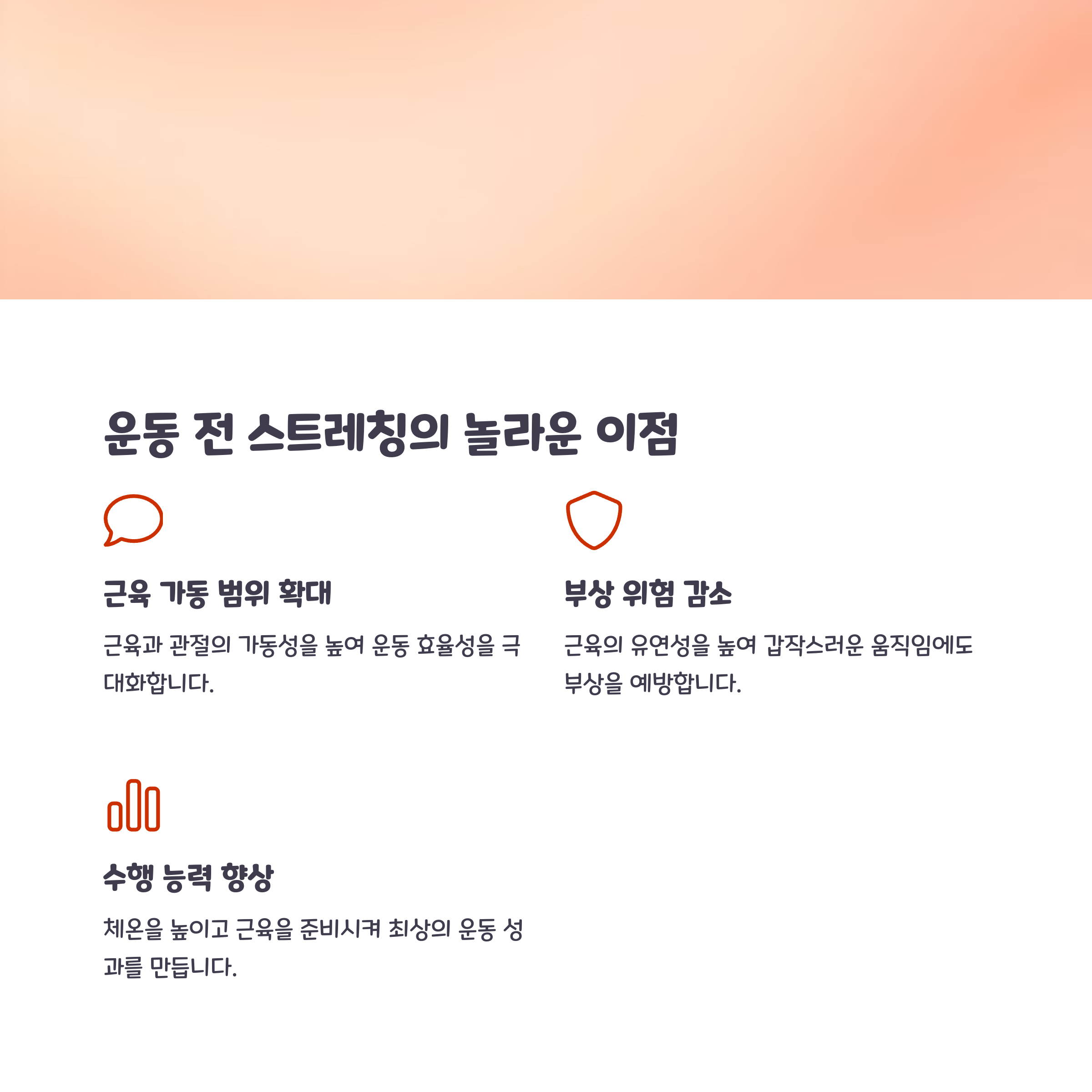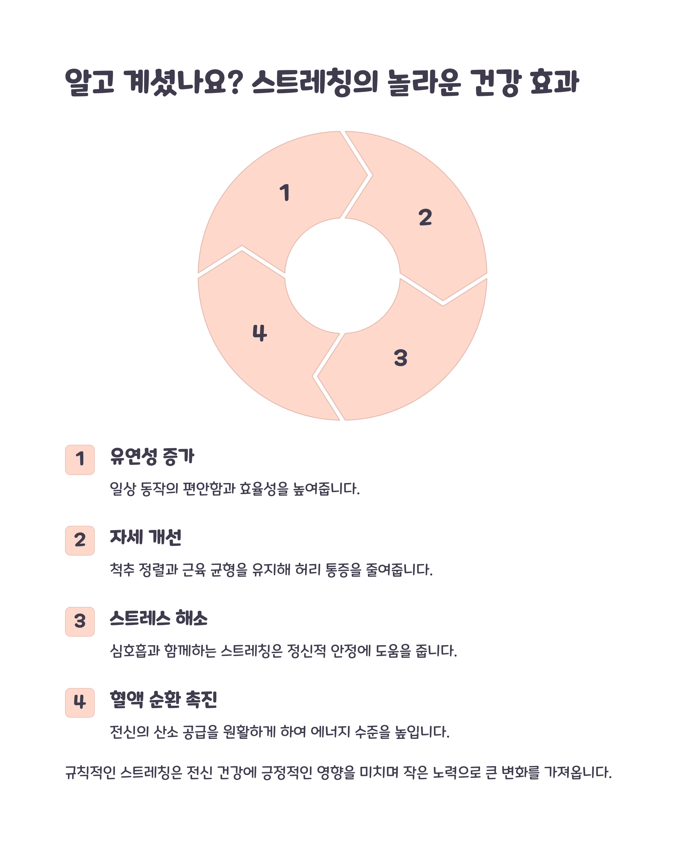 | 스트레칭은 근육의 긴장을 풀어주고, 혈액 순환을 촉진합니다. | 유연성 향상은 운동 성능을 높이고, 부상을 예방합니다. | 스트레칭을 통해 부상 예방 효과를 얻을 수 있습니다. |