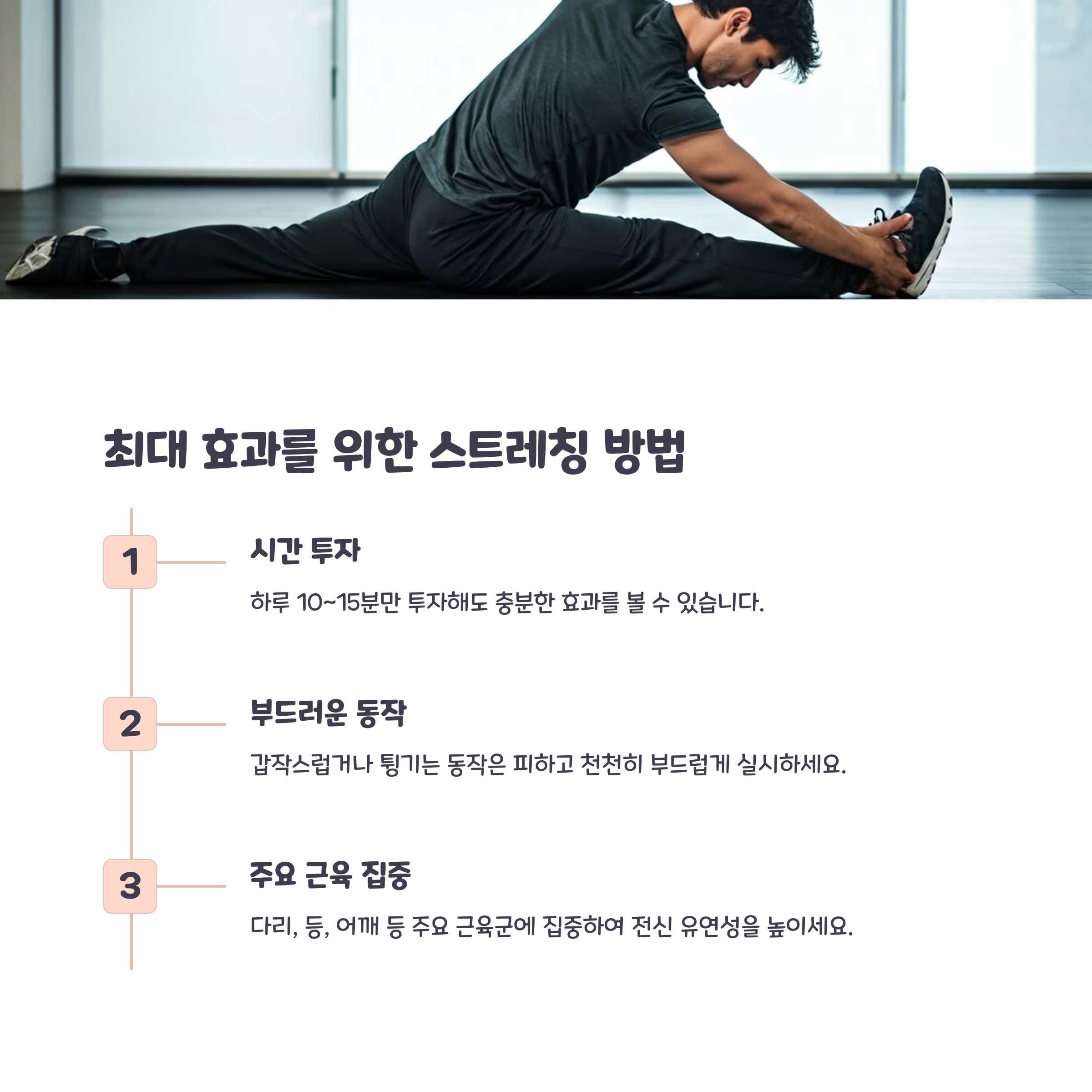 다양한 스트레칭 동작을 통해 유연성을 증가시킬 수 있습니다. 유연성이 높아지면 운동 효율이 높아지고, 근육과 관절에 가해지는 부담이 줄어듭니다. 특히, 운동 후에 스트레칭을 통해 근육을 풀어주면 회복이 더 빨라지고, 근육 경직을 방지할 수 있습니다. 이런 간단한 습관이 장기적으로 큰 효과를 가져옵니다.