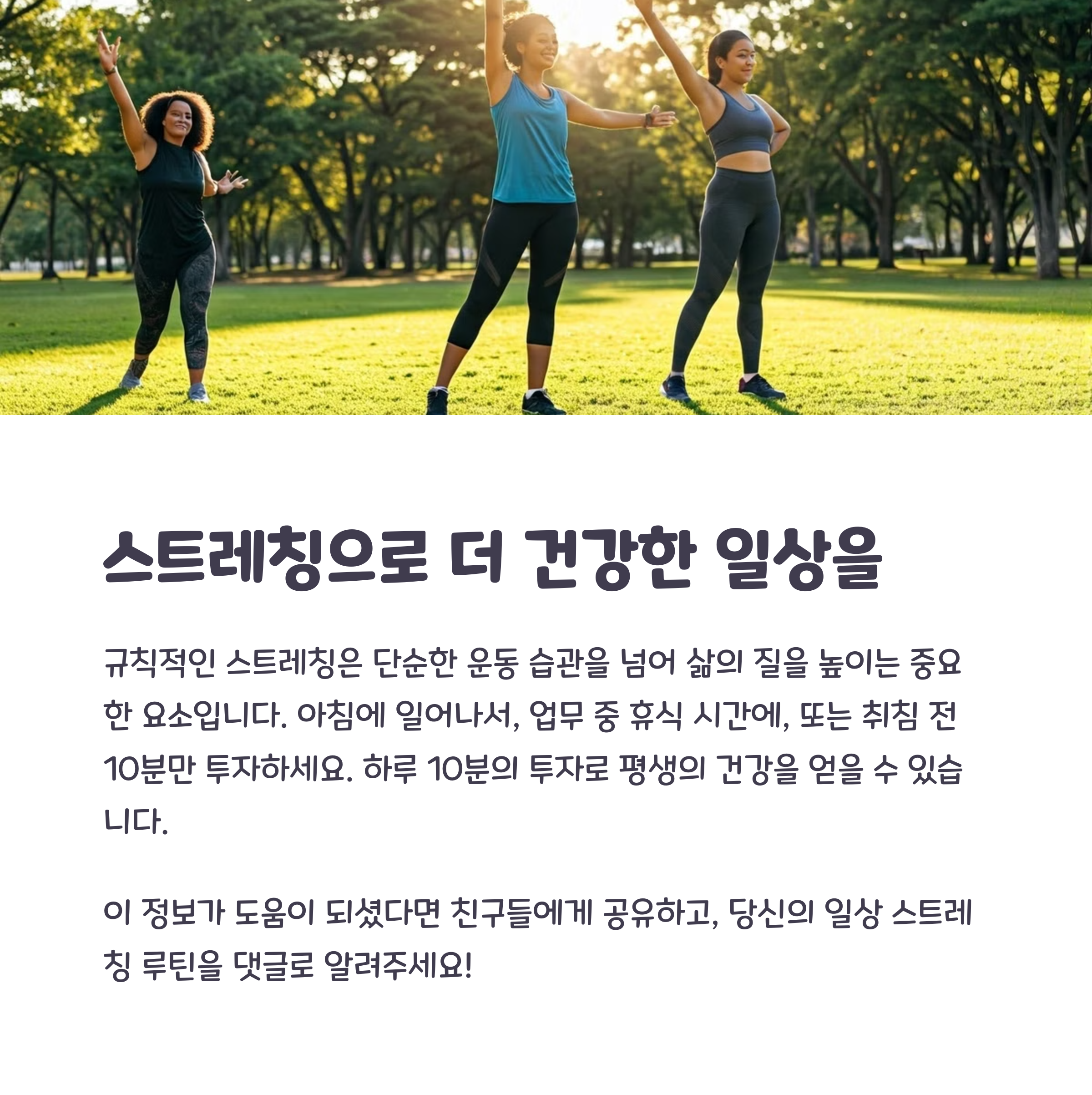스트레칭은 부상 예방뿐만 아니라, 건강한 생활을 유지하는 데 중요한 역할을 합니다. 꾸준히 스트레칭을 실천하여 부상 없는 건강한 삶을 영위하시길 바랍니다.