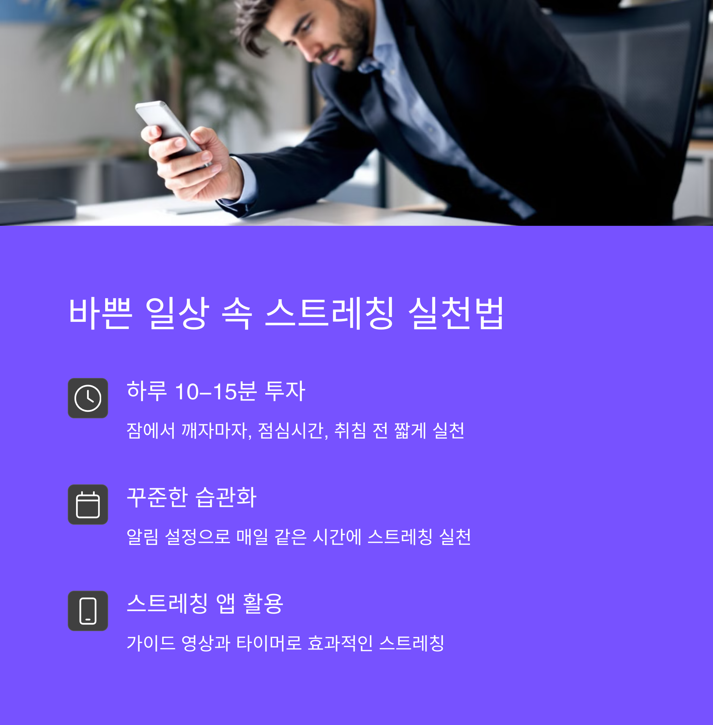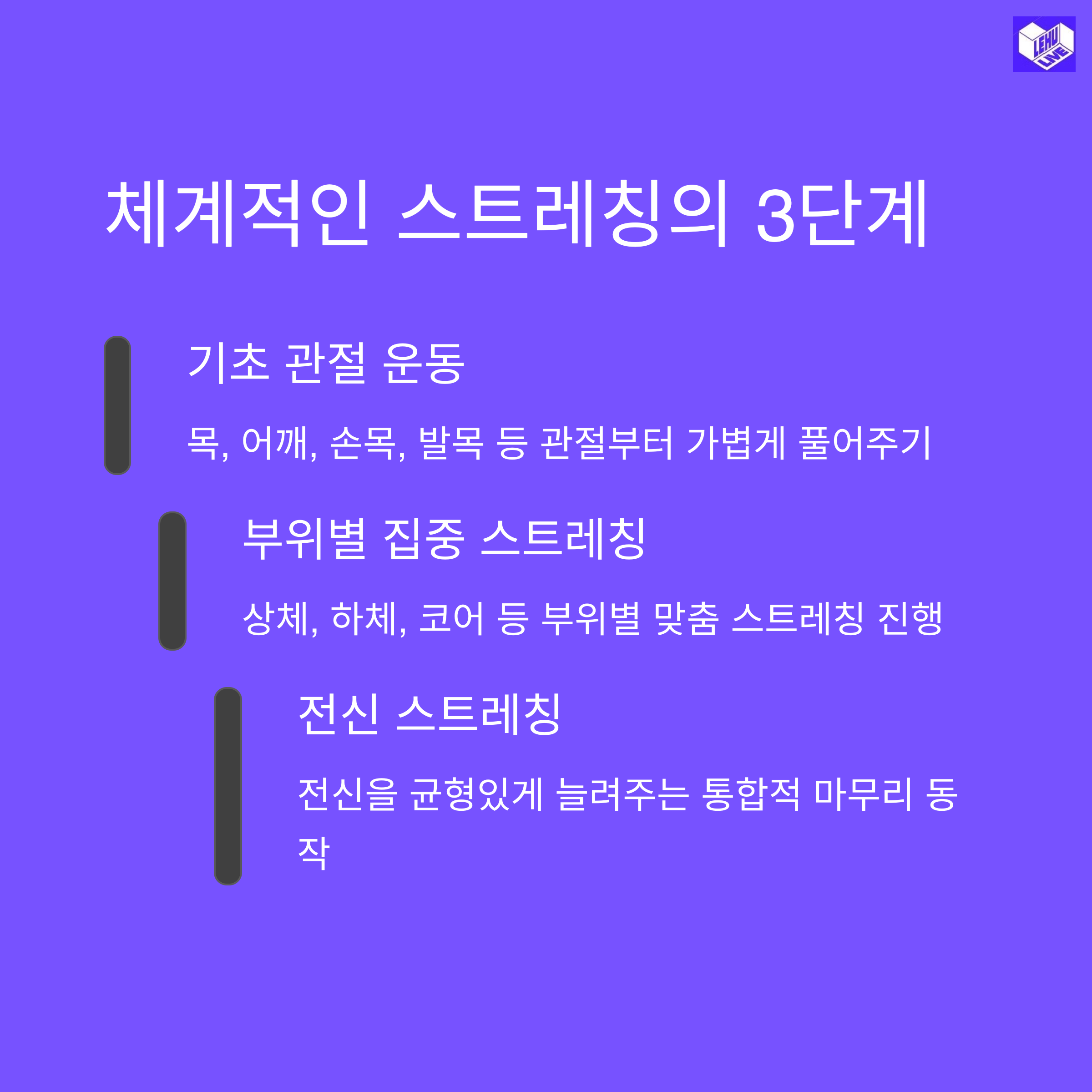 | 단계별 스트레칭 | 기초 → 부위별 → 전신 | 신체 균형 유지, 혈액순환 개선 |