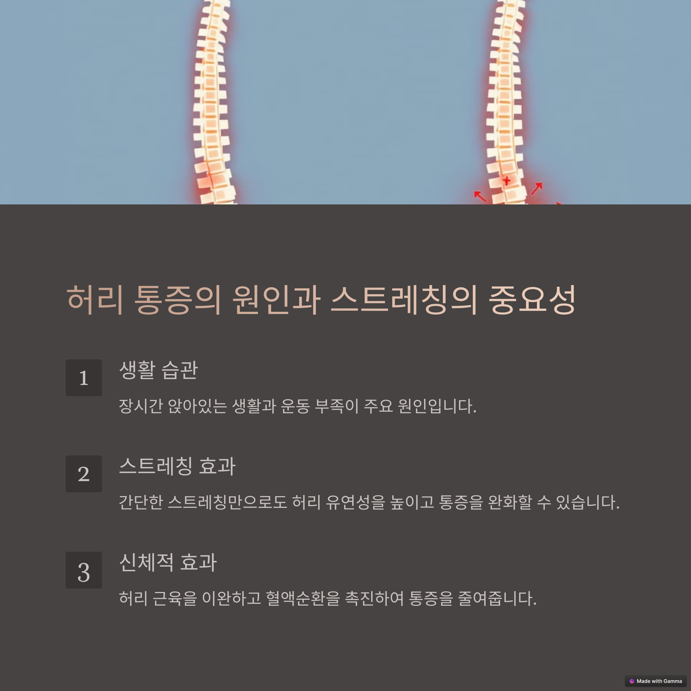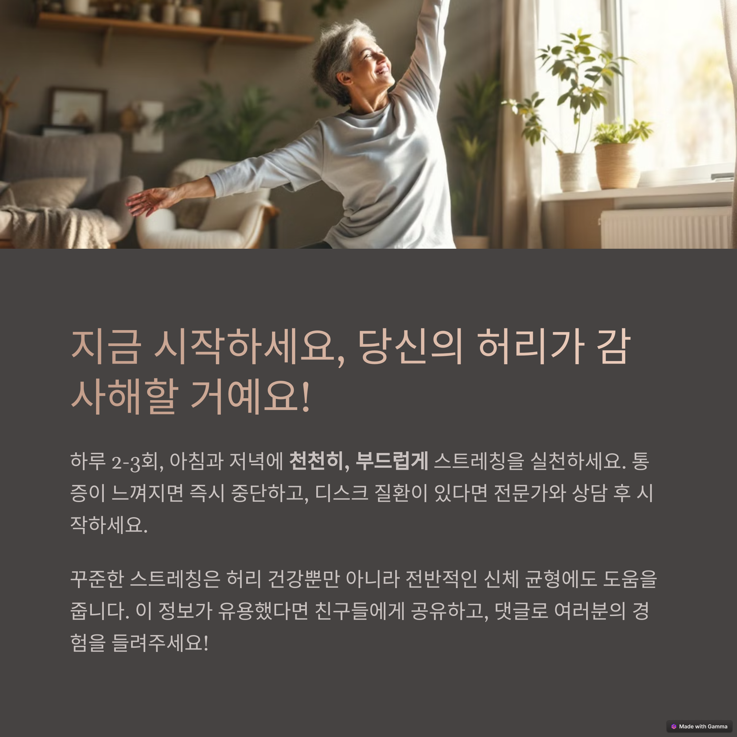 꾸준한 스트레칭은 허리 건강을 지키는 가장 효과적인 방법 중 하나입니다. 매일 10분만 투자하면 허리 통증을 예방하고, 보다 유연하고 건강한 생활을 유지할 수 있습니다. 작은 습관의 변화가 큰 건강의 차이를 만듭니다. 지금부터라도 허리 스트레칭을 실천해 보세요!