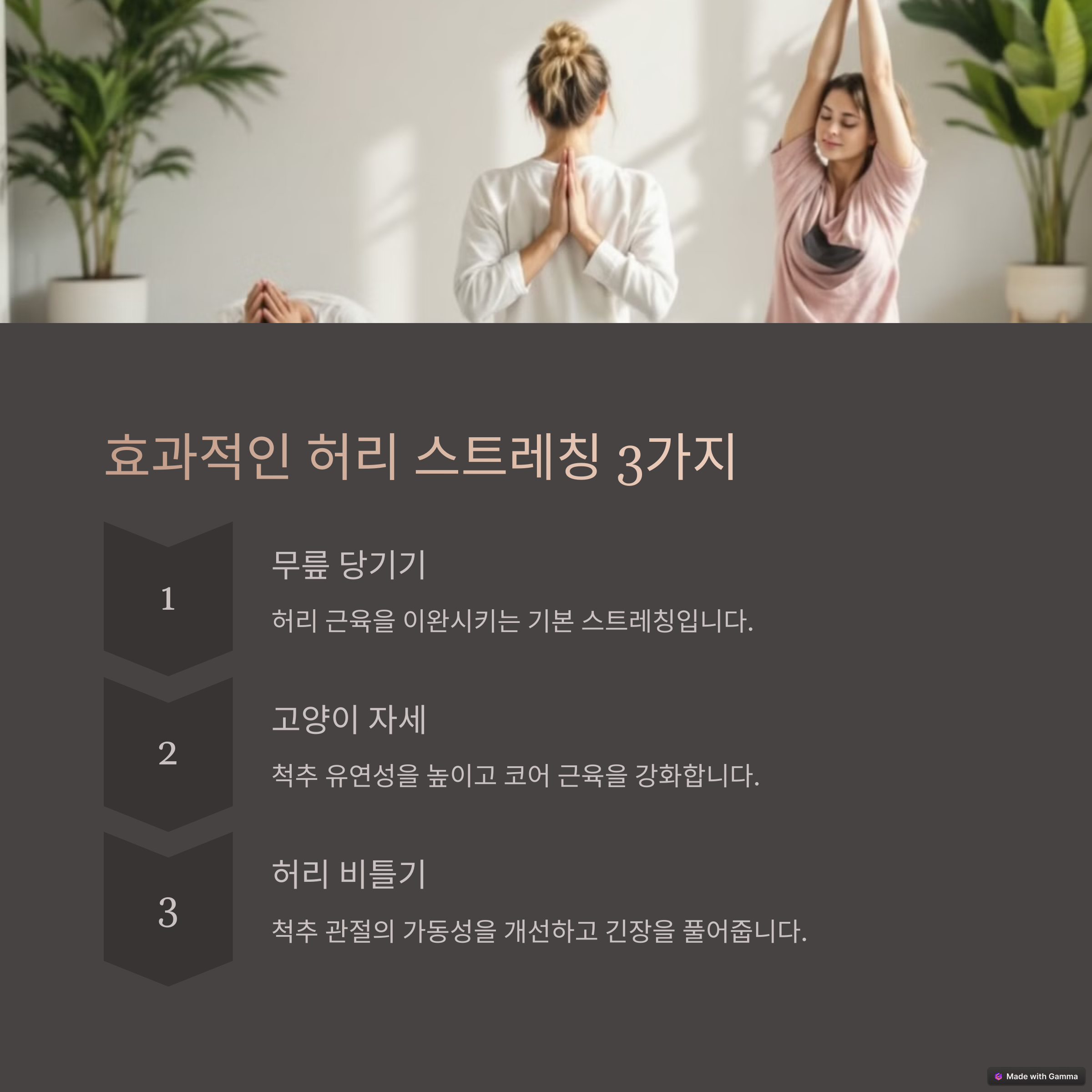 대표적인 허리 스트레칭으로는 **무릎 당기기, 고양이 자세, 허리 비틀기** 등이 있습니다. 이러한 동작들은 허리 주변 근육을 효과적으로 풀어주며, 혈액순환을 촉진하여 통증을 줄이는 데 도움을 줍니다. 꾸준히 실천하면 허리 건강이 개선될 뿐만 아니라, 전반적인 신체 균형을 유지하는 데도 유익합니다.