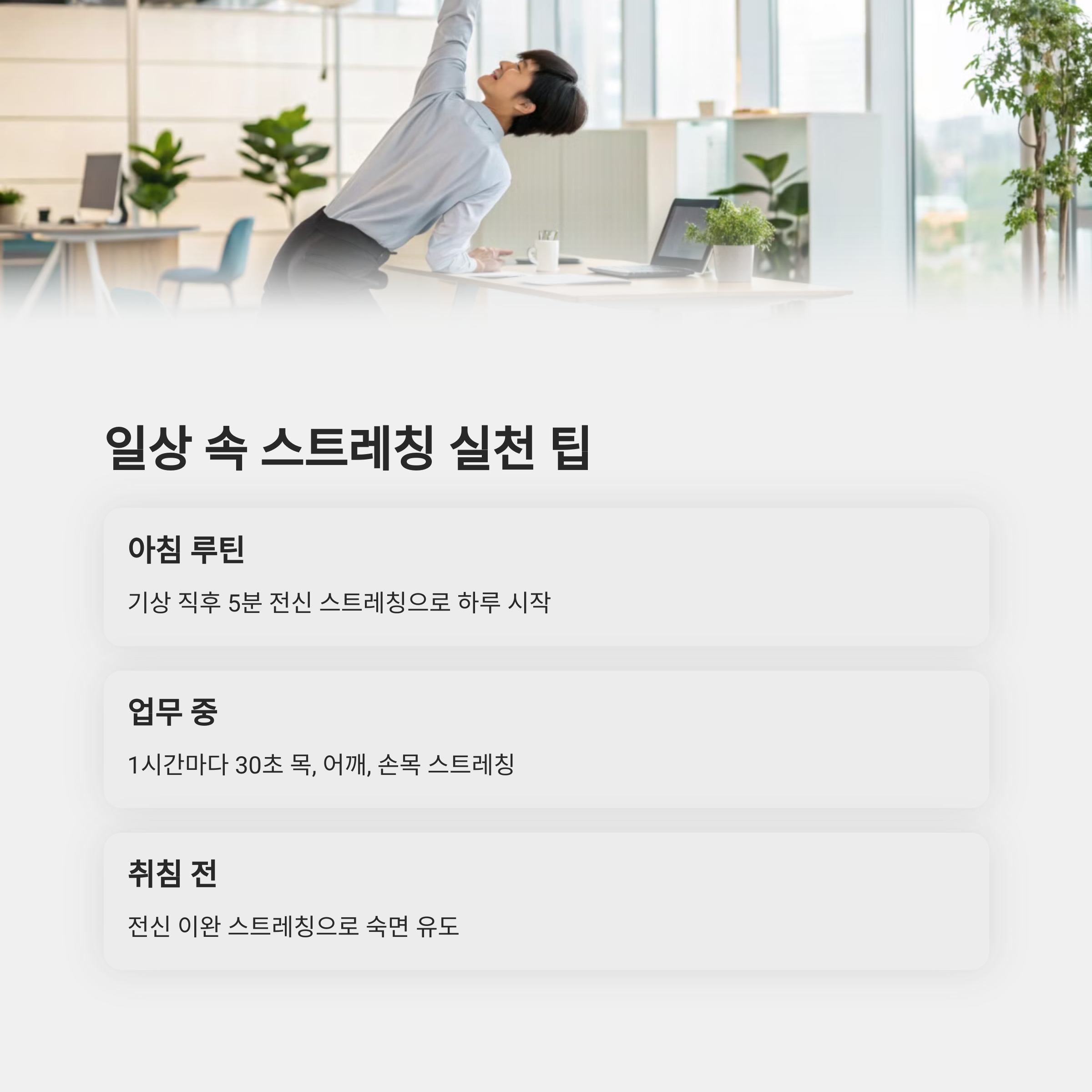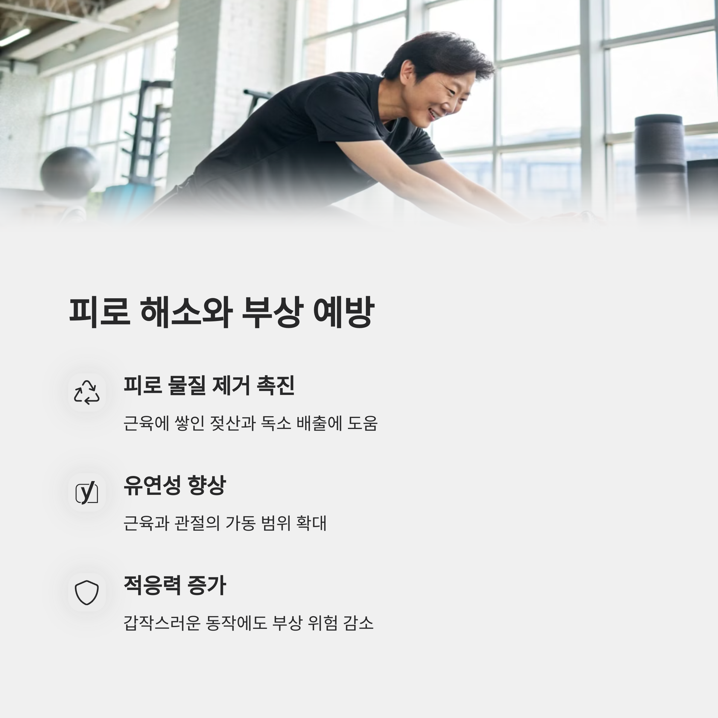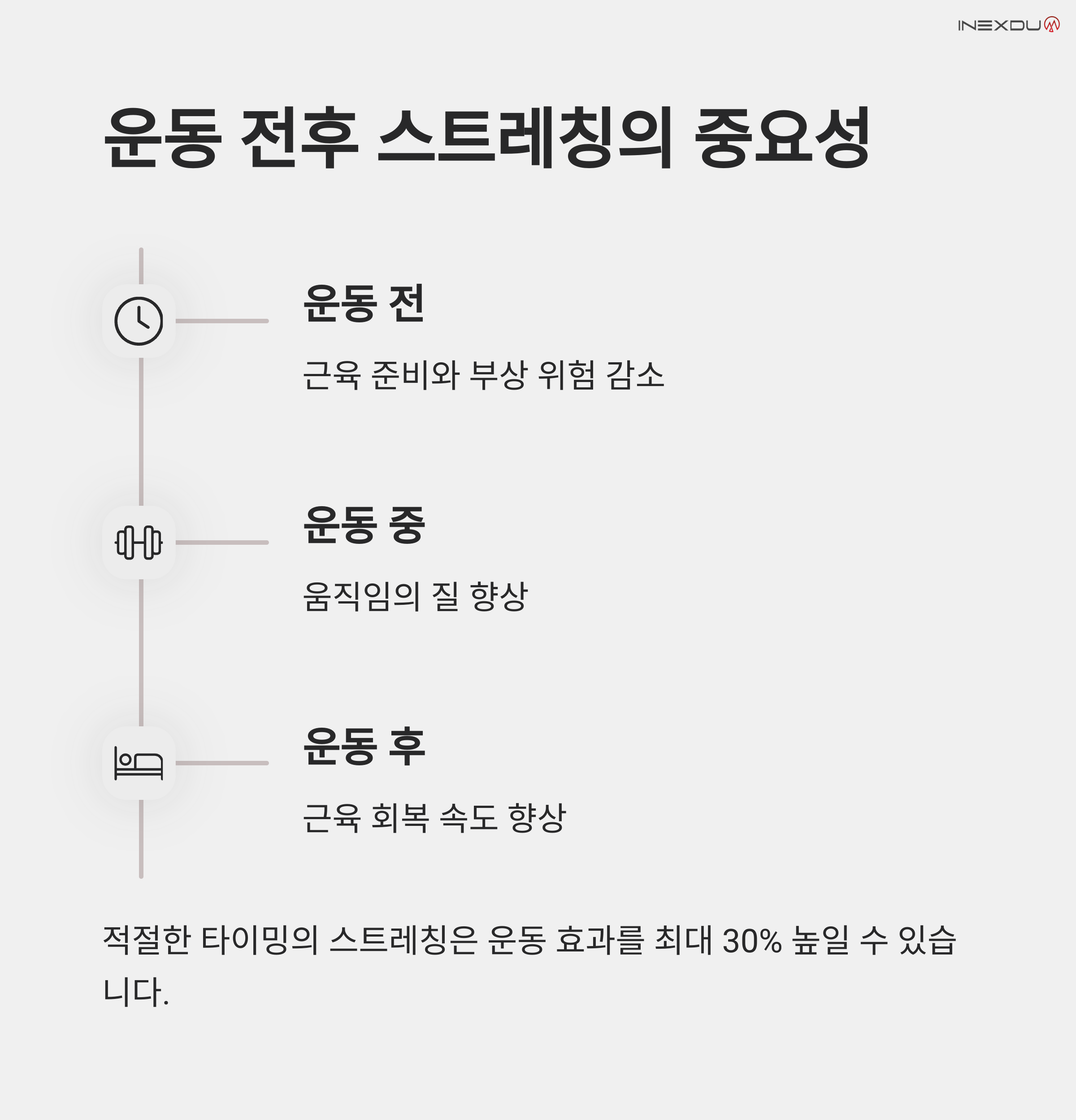 | 꾸준한 스트레칭의 효과 증대 | 혈류 증가로 피로물질 제거 | 운동 전후 필수 루틴 |