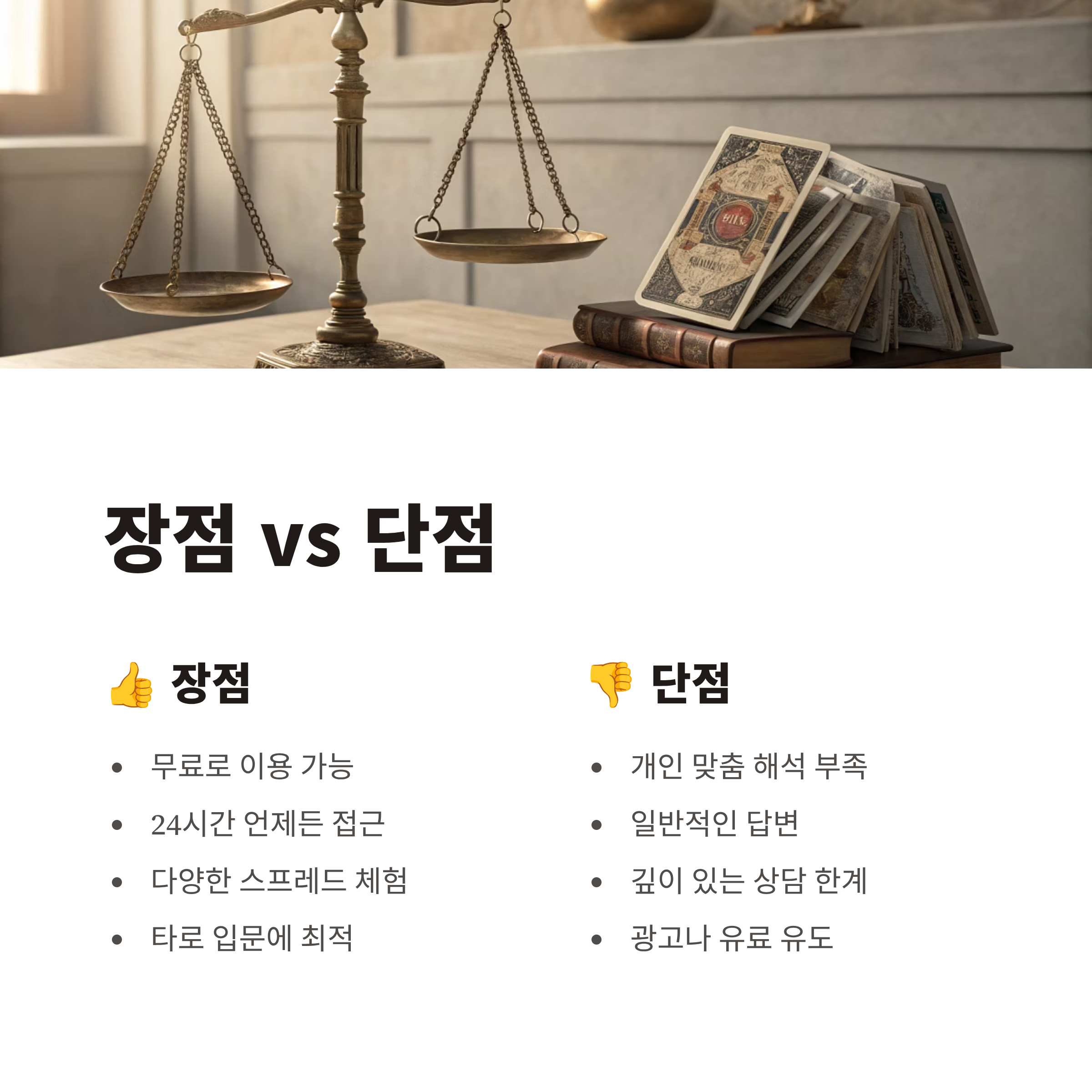무료 타로점은 분명 매력적이지만, 장점과 단점을 명확히 알고 활용해야 합니다.