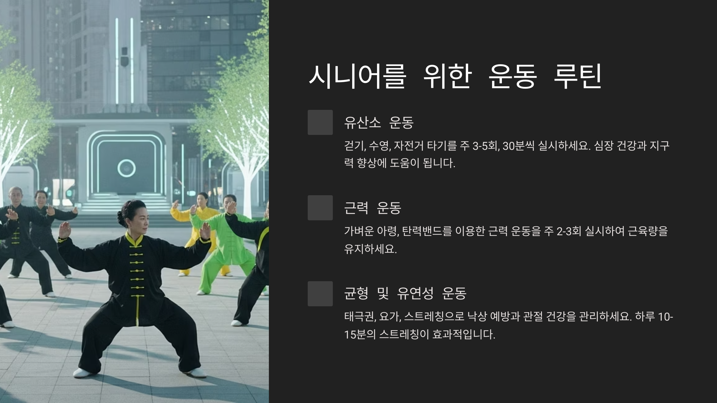 운동은 시니어 건강에 있어 가장 확실한 ‘약’이에요. 꾸준한 운동은 근육량 유지뿐 아니라, 관절 건강, 혈액순환, 정신건강까지 개선해줘요. 나이가 들수록 움직임이 줄어드는 경향이 있지만, 오히려 ‘움직여야’ 건강을 지킬 수 있어요.