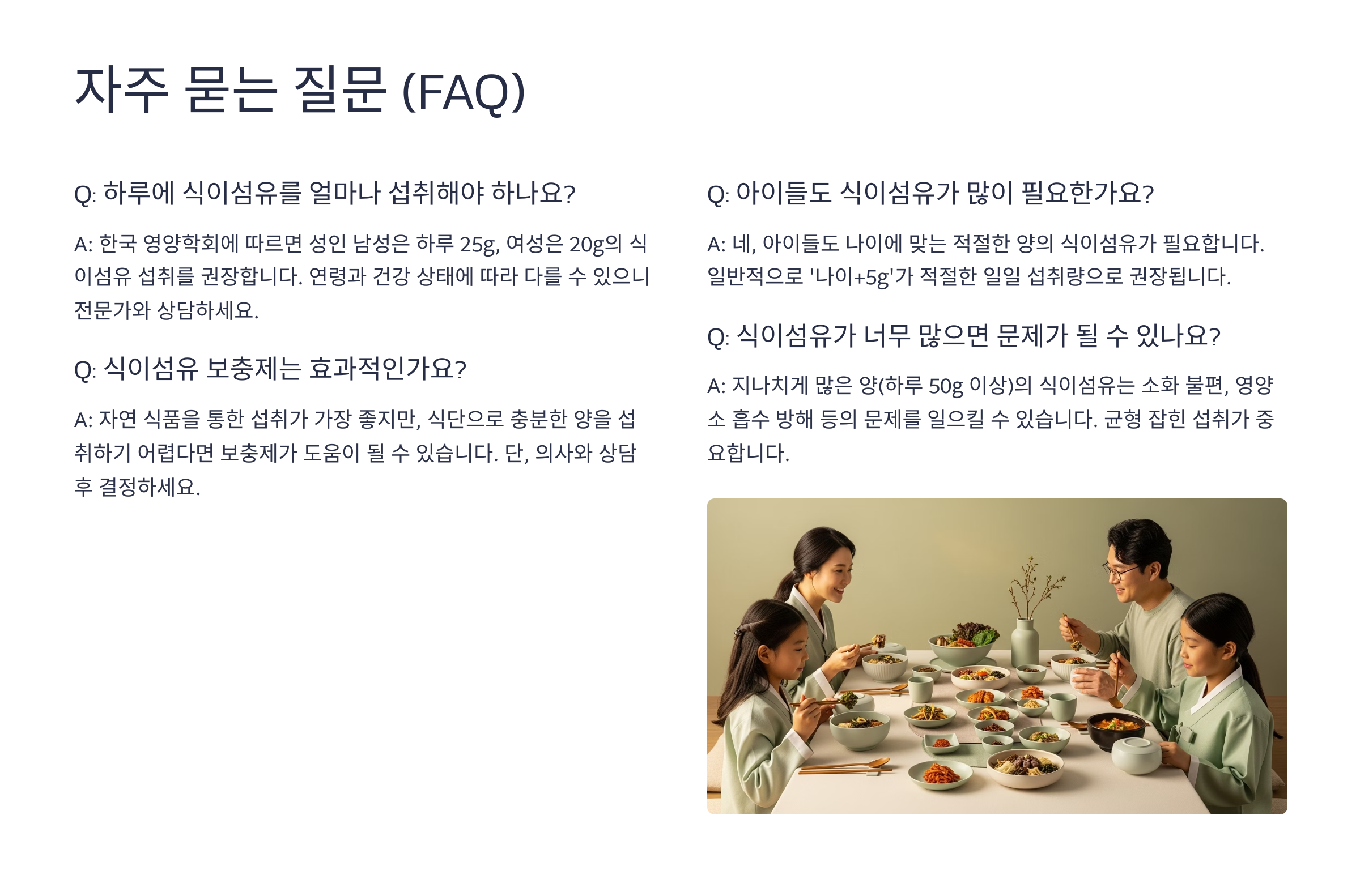 A7. 네, 성장기 아이들에게도 식이섬유는 장 건강과 전반적인 성장에 중요합니다. 다만 성인보다 소화 능력이 약하므로 너무 많은 양보다는 나이와 활동량에 맞춰 적절한 양을 제공하는 것이 필요합니다.