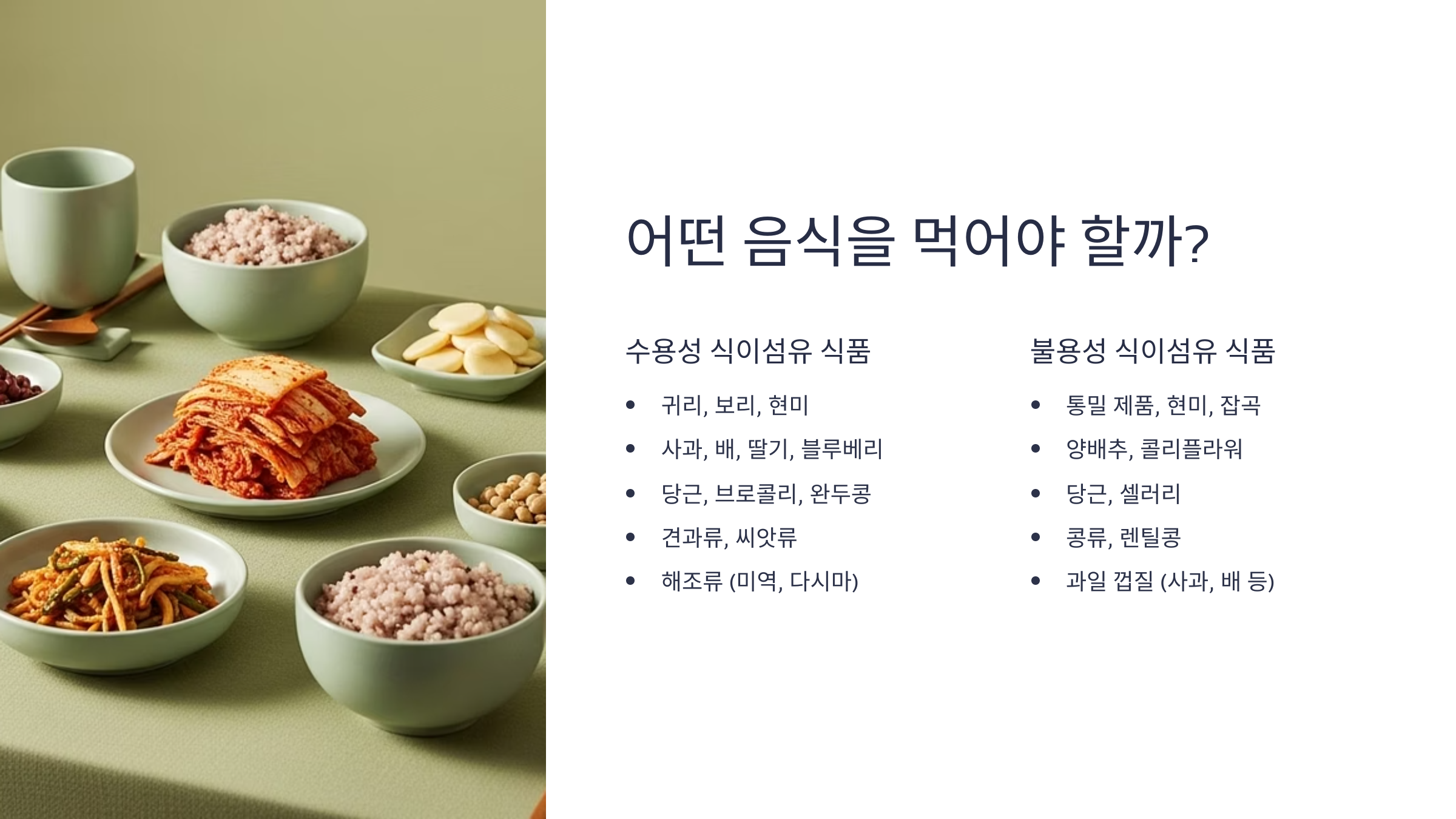 | 불용성 식이섬유 | 장 운동 촉진, 변비 예방 | 채소, 곡물 겉껍질, 견과류 |