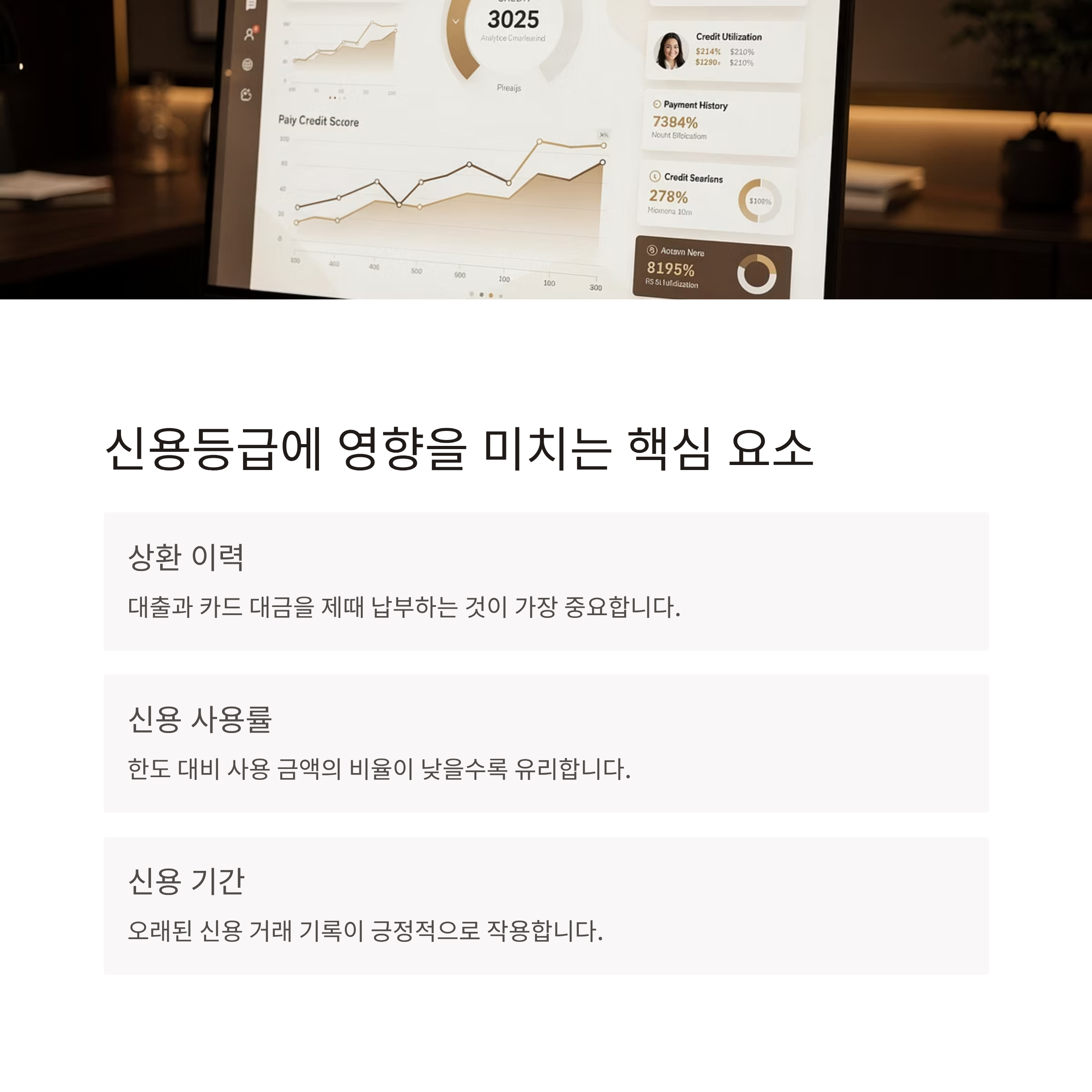 대출, 신용카드 발급, 전세대출 등 우리가 살아가면서 필요한 많은 금융 거래에는 '신용등급(혹은 신용점수)'이 중요한 기준이 됩니다. 신용등급이 낮으면 대출이 어렵거나 높은 이자를 내야 하고, 심지어 사회생활에도 불이익을 받을 수 있습니다. 하지만 많은 분들이 신용등급을 어떻게 관리해야 할지 막막해합니다.