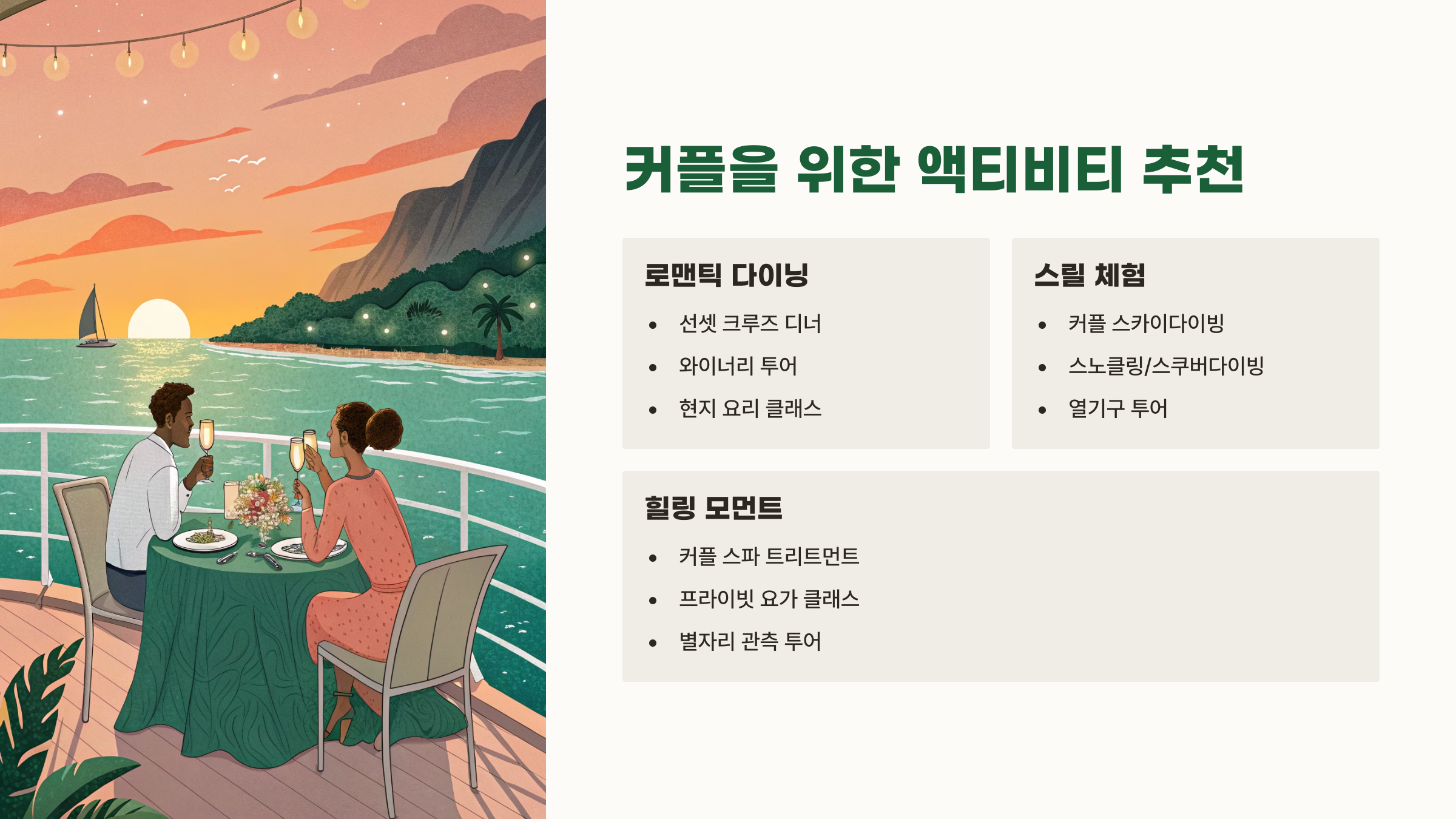 신혼여행은 그저 쉬기만 하는 게 아니라, 둘만의 특별한 추억을 남기는 시간이에요! 🤗 그래서 커플 액티비티를 꼭 챙기는 게 좋답니다.
