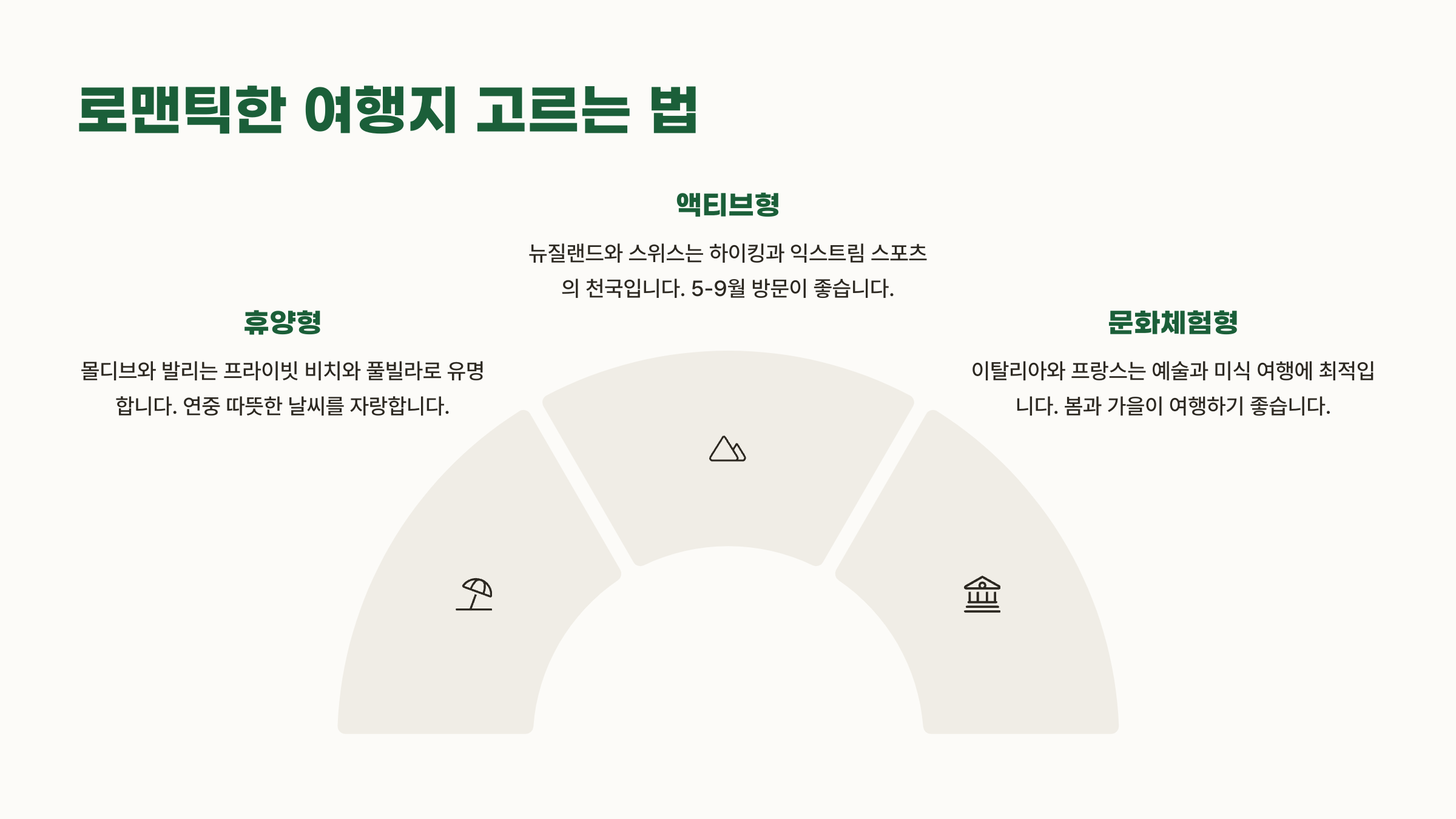 여행지는 신혼여행의 분위기를 완전히 좌우해요! 둘만의 특별한 기억을 만들기 위해서는 진짜 둘이 원하는 스타일을 찾아야 해요. 🌟