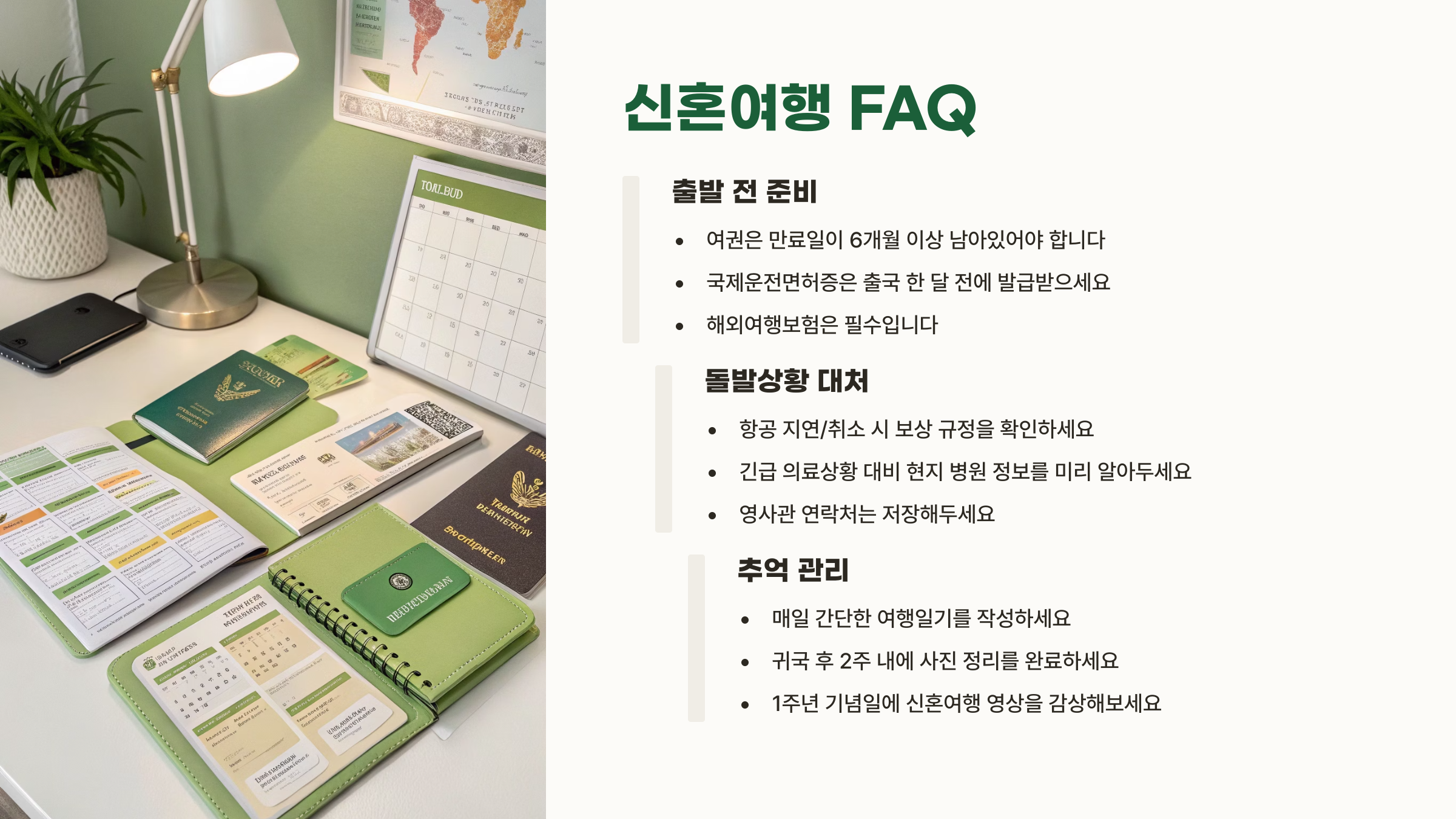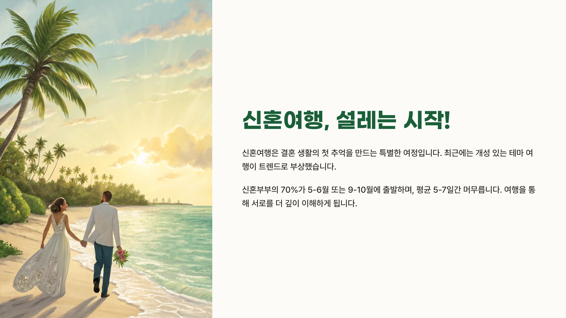 ✨ 신혼여행은 둘만의 첫 공식 여행이라 정말 특별해야 해요. 일정 하나하나가 추억이 되기 때문에 꼼꼼하고 로맨틱하게 준비하는 게 중요하답니다!