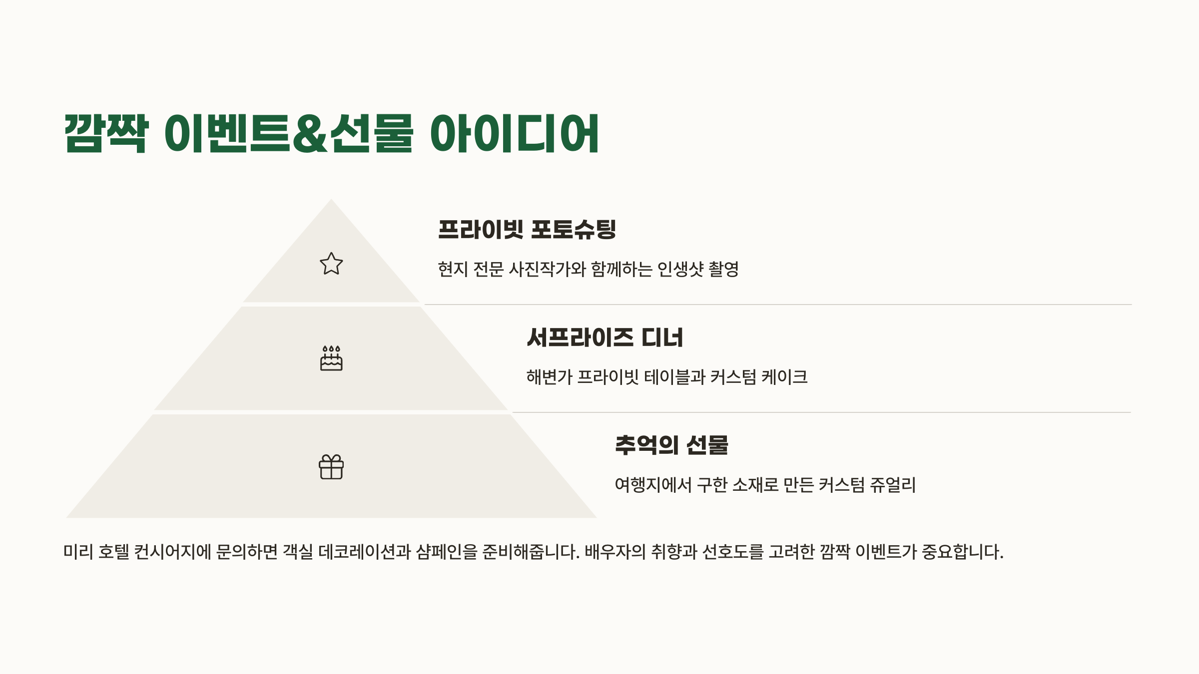 신혼여행에서 깜짝 이벤트 하나쯤 준비하면, 평생 잊지 못할 감동을 선물할 수 있어요! 🎈 소소하지만 진심 어린 서프라이즈가 핵심이랍니다.