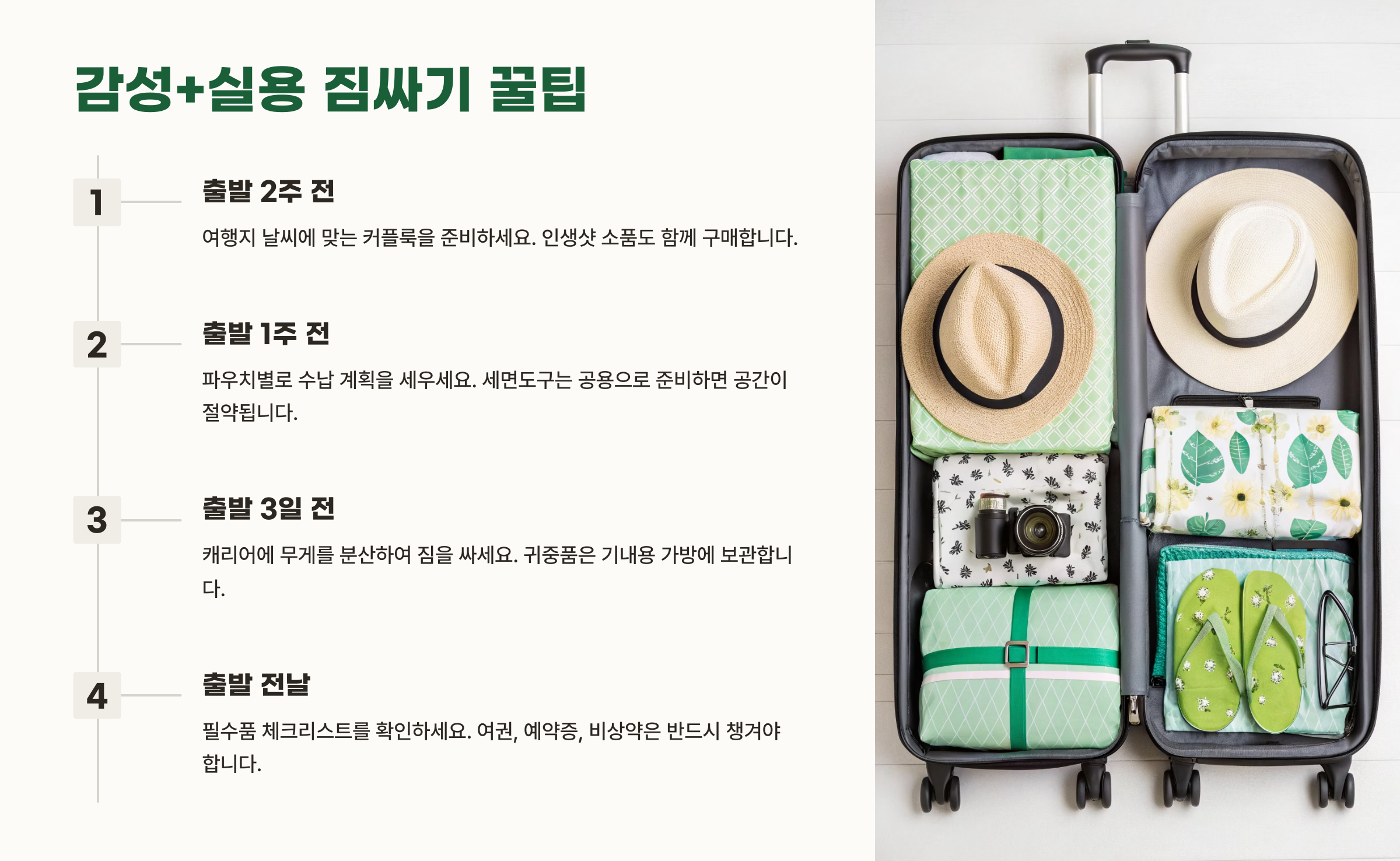 신혼여행 짐싸기는 평소 여행보다 더 설레는 과정이에요. 둘만의 스타일을 담은 짐을 준비하면 여행 내내 기분이 좋아진답니다. 🎁