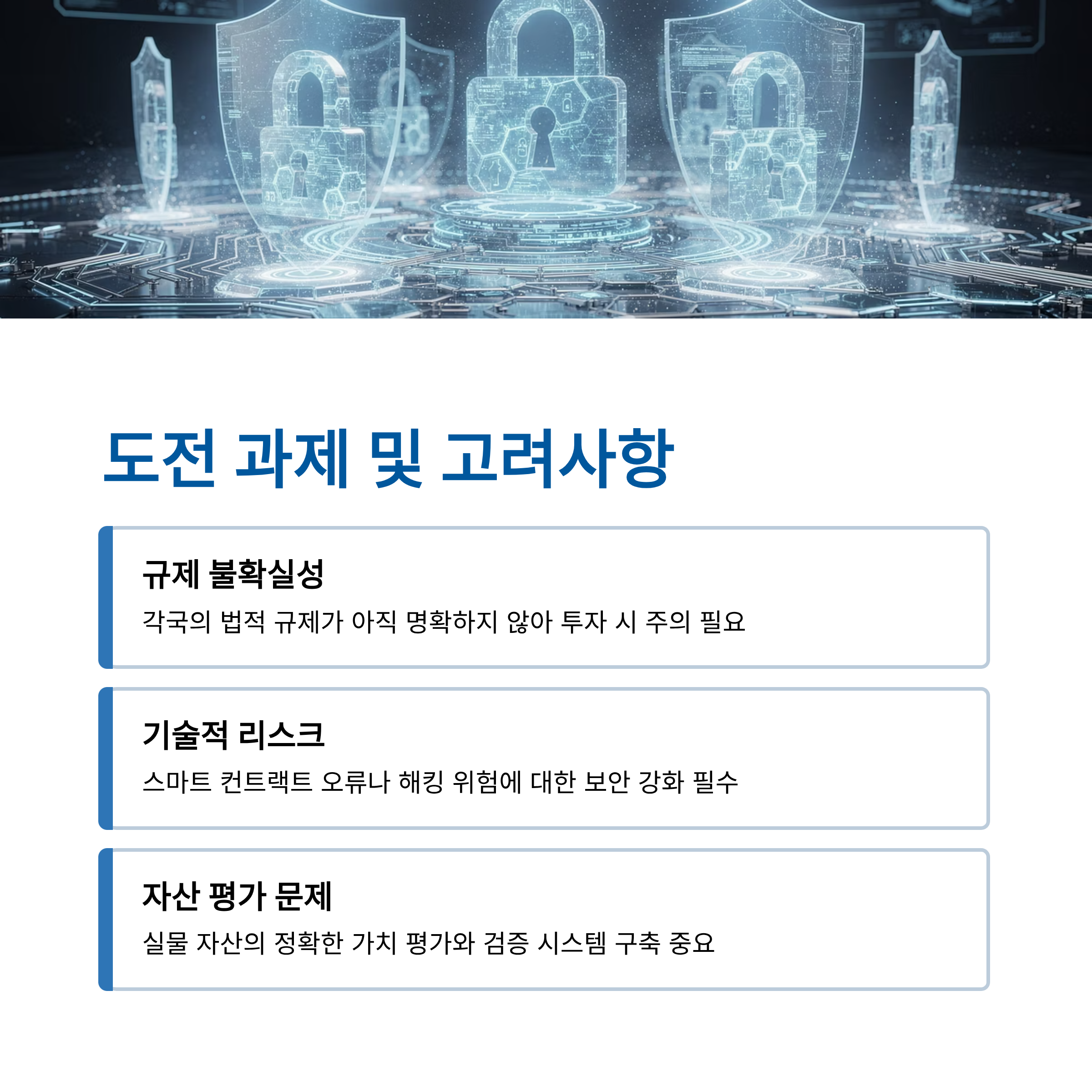 - 토큰화되는 실물 자산의 가치를 정확하고 투명하게 평가하고, 그 실재 여부를 지속적으로 검증하는 시스템이 필요합니다.