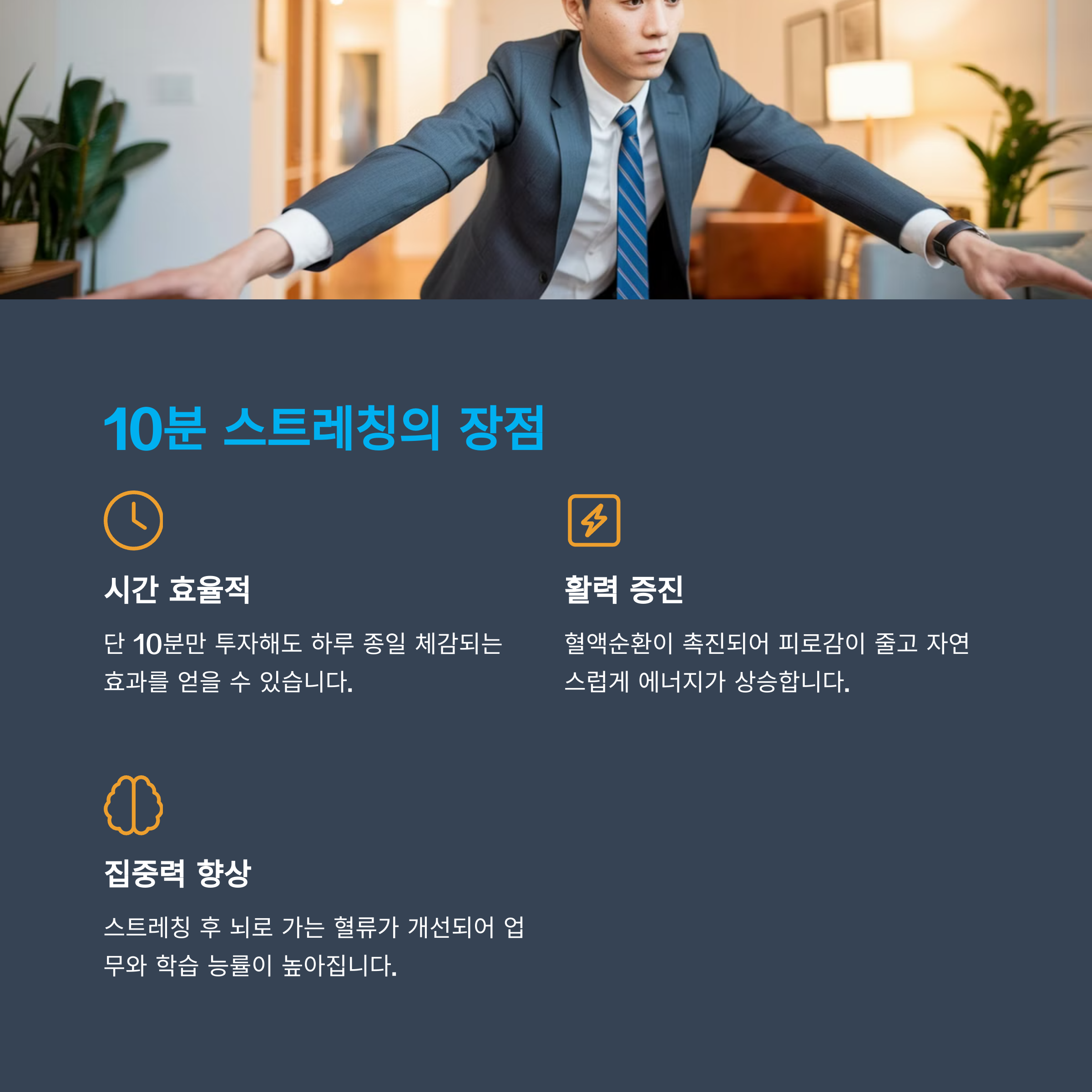 | 10분 | 목, 어깨, 허리 스트레칭 | 활력 증진, 혈액순환 개선 |