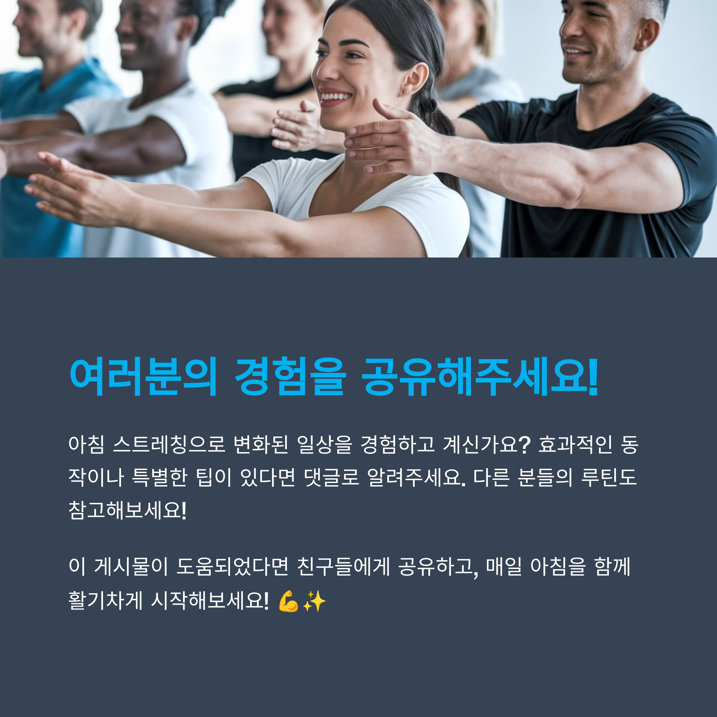 여러분은 아침에 스트레칭을 하시나요? 가장 효과적인 동작이나 본인만의 팁이 있다면 댓글로 공유해주세요!