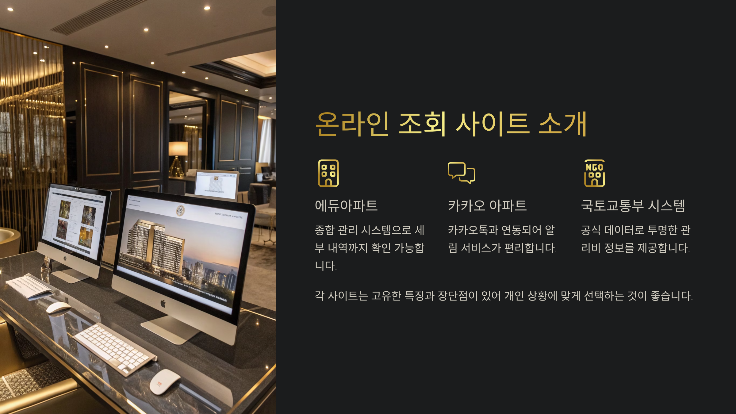 | 아파트 전용 웹사이트 | 상세 내역 제공, 빠른 확인 | 단지별 접근성 다름 |