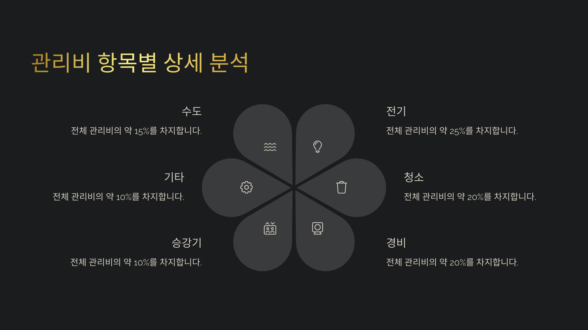관리비 항목은 보통 ‘공용관리비’, ‘개별사용료’, ‘장기수선충당금’ 이렇게 크게 세 가지로 나눌 수 있어요. 공용관리비는 공용시설을 유지하는 비용, 개별사용료는 각 세대에서 사용하는 전기·수도·가스 등이에요. 장기수선충당금은 향후 큰 수리를 위한 적립금이에요.