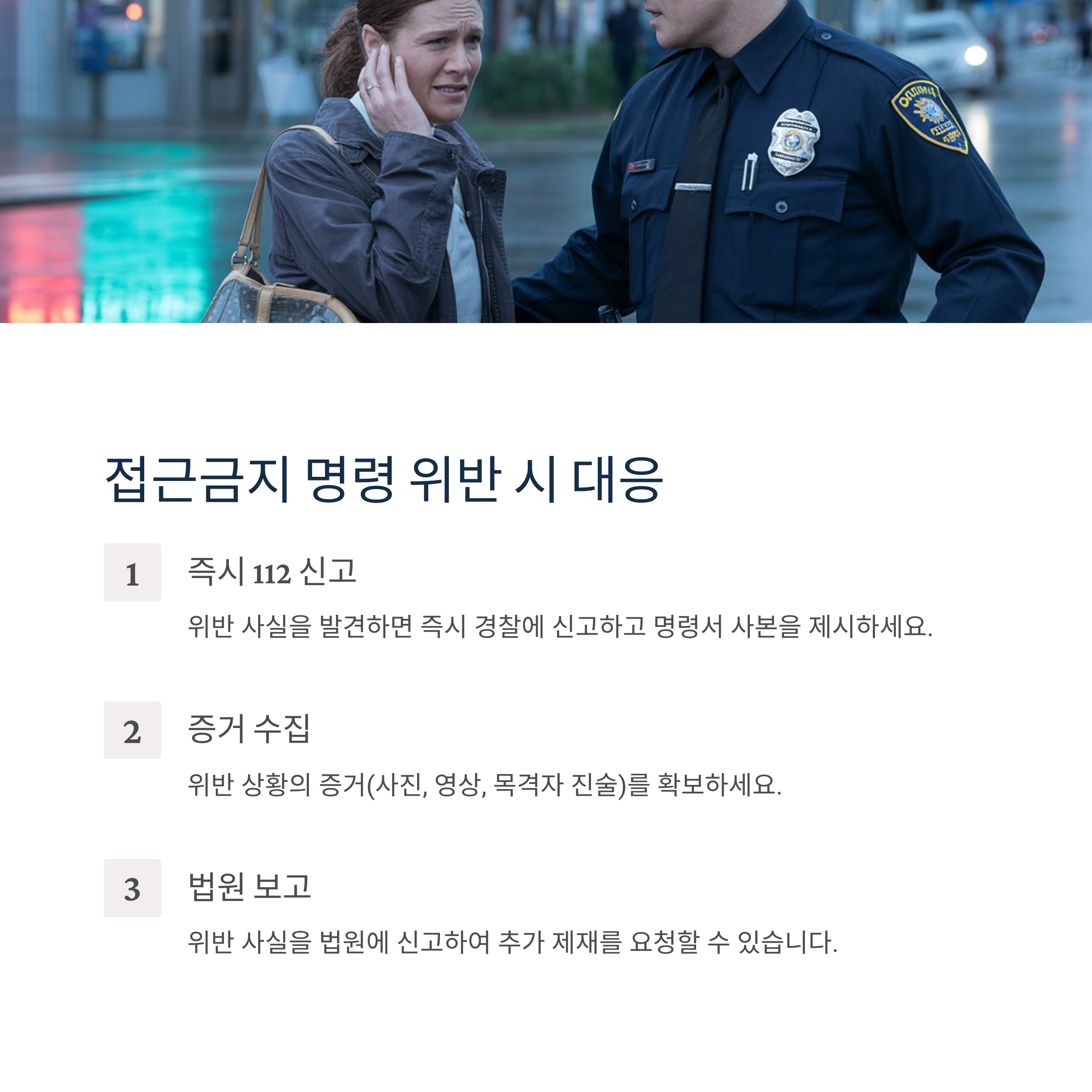 접근금지 명령은 여러분의 안전을 위한 '방패'입니다. 위반 상황 발생 시 주저하지 말고 적극적으로 대처하여 스스로를 보호하세요. 🚨