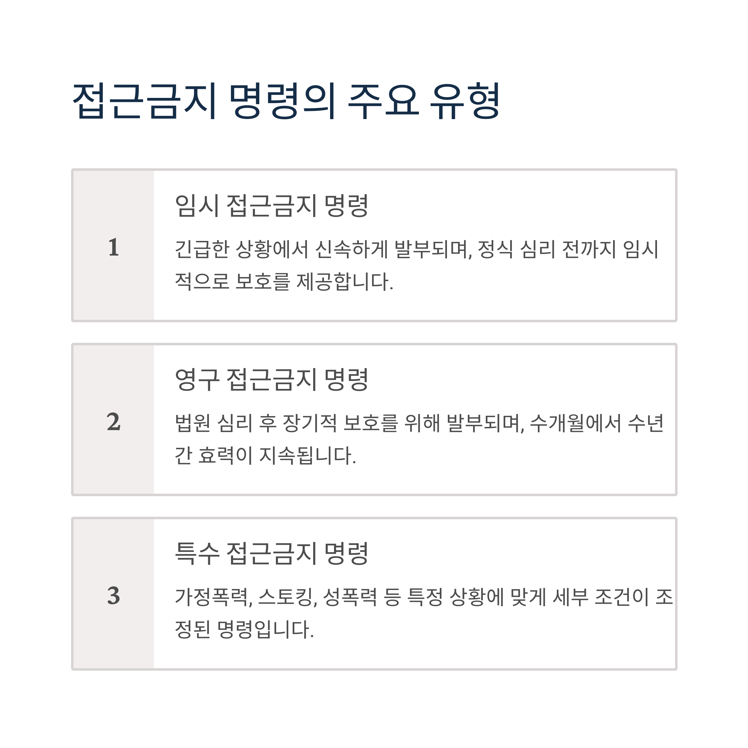 자, 그럼 다음은 스토킹과 가정폭력 상황에서 신청할 수 있는 ‘접근금지 명령의 주요 유형’에 대해 알아볼 차례예요. 📝