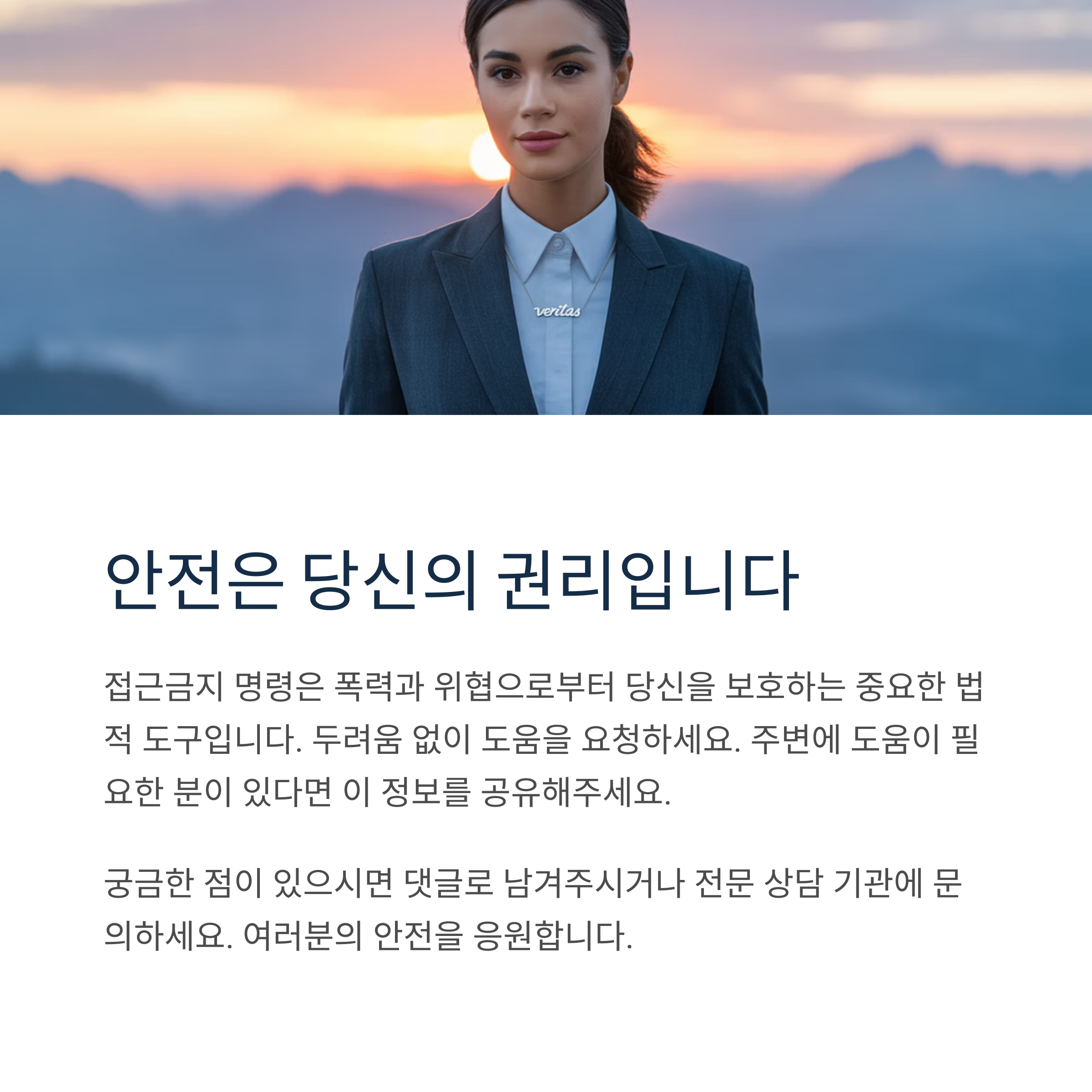 접근금지 명령은 여러분의 안전을 위한 '방패'입니다. 위반 상황 발생 시 주저하지 말고 적극적으로 대처하여 스스로를 보호하세요. 🚨