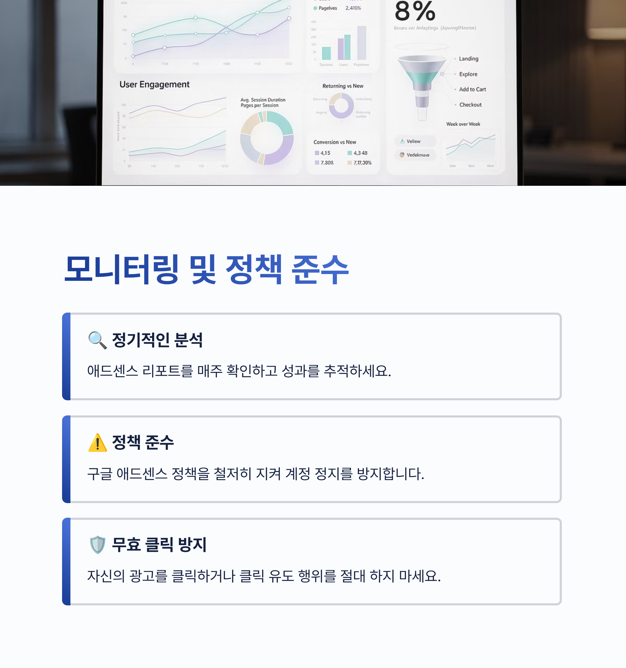 - 콘텐츠 품질 유지: 저품질 콘텐츠나 저작권 위반 콘텐츠는 광고 노출 제한이나 계정 정지로 이어질 수 있습니다.