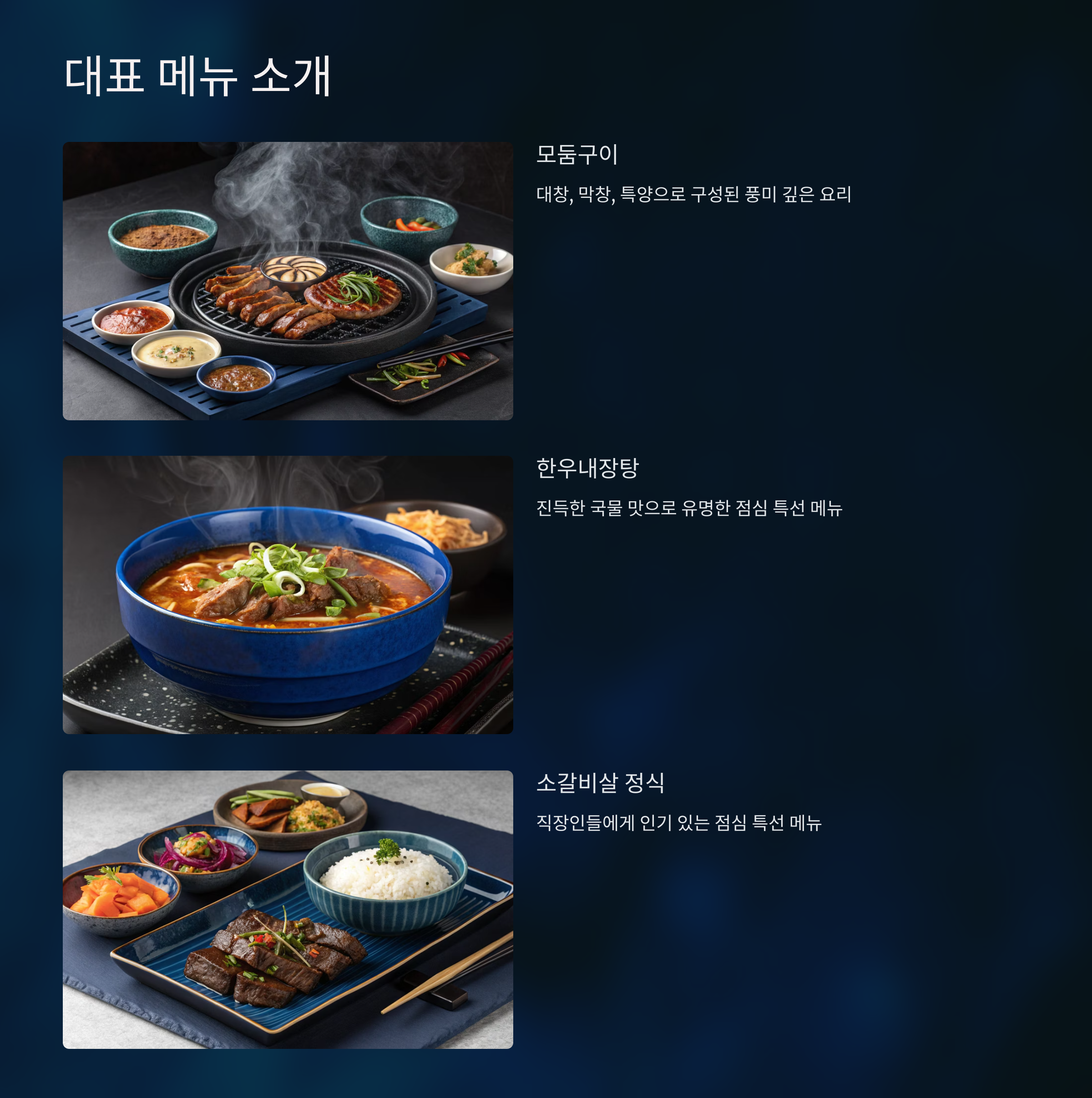 특히 점심 특선인 소갈비살 정식과 진득한 국물 맛으로 유명한 한우내장탕은 직장인들에게 이미 소문난 베스트 메뉴입니다.