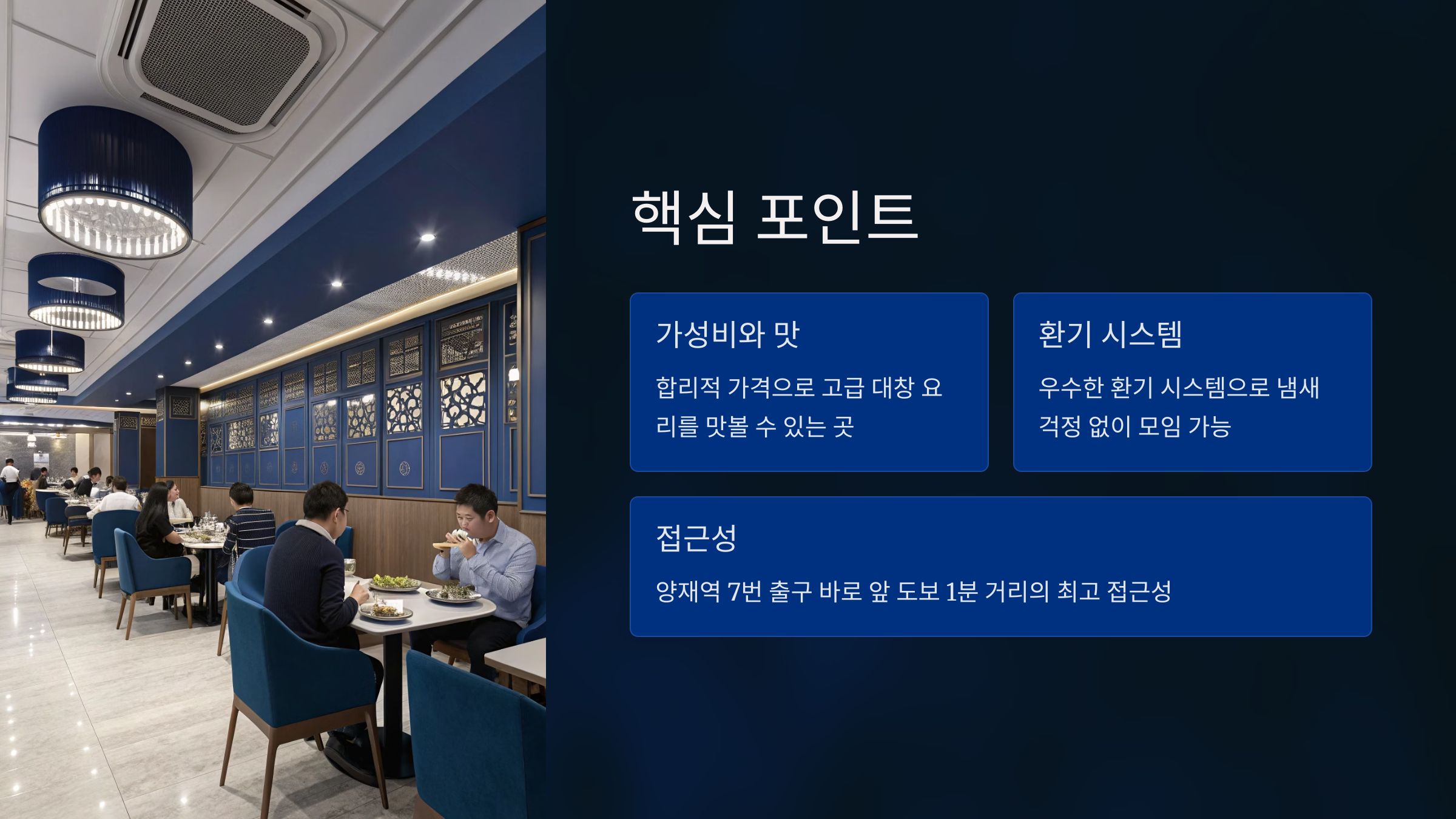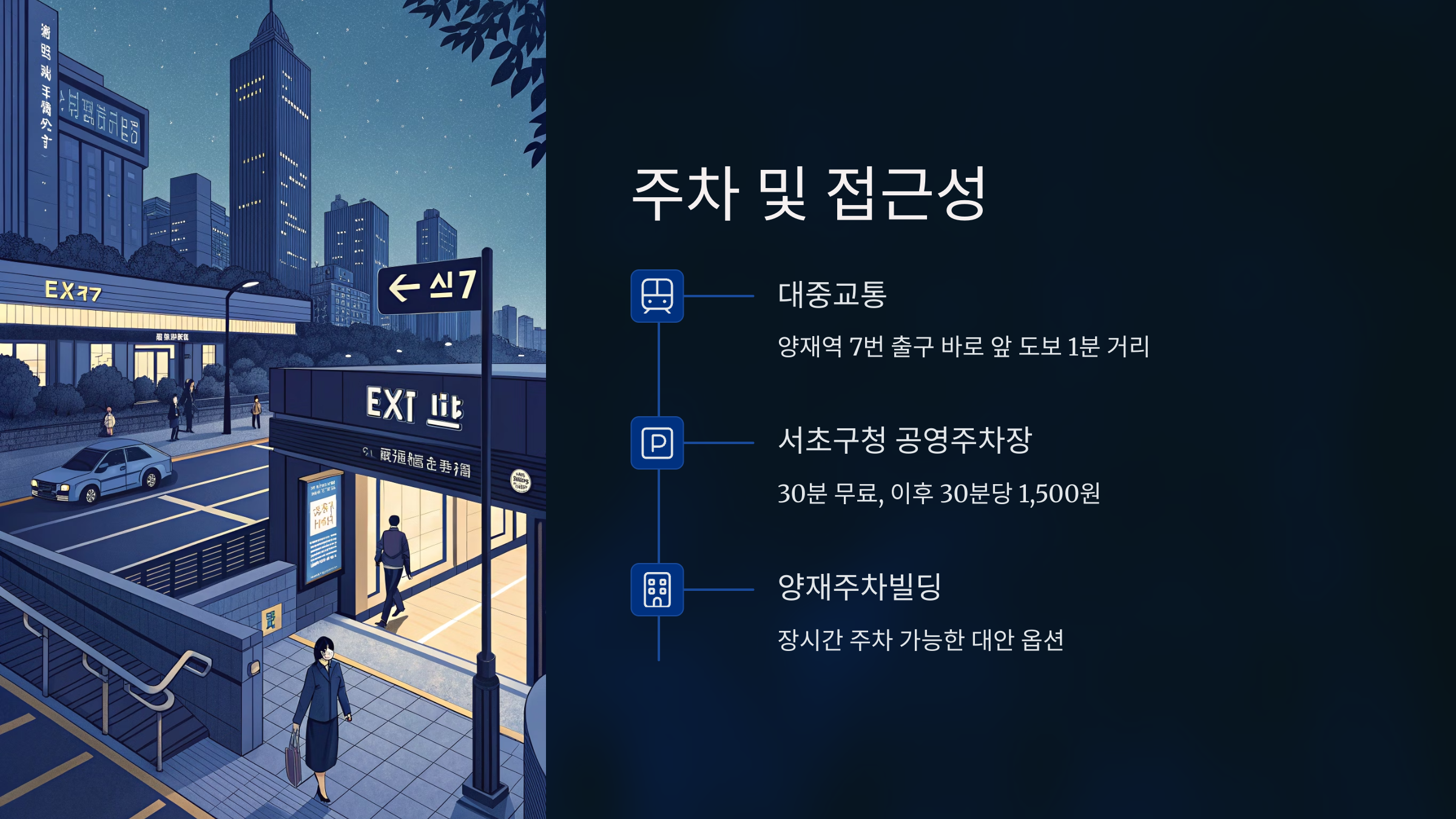 주요 위치는 양재역 7번 출구 바로 앞으로 도보 1분 거리에 있습니다.