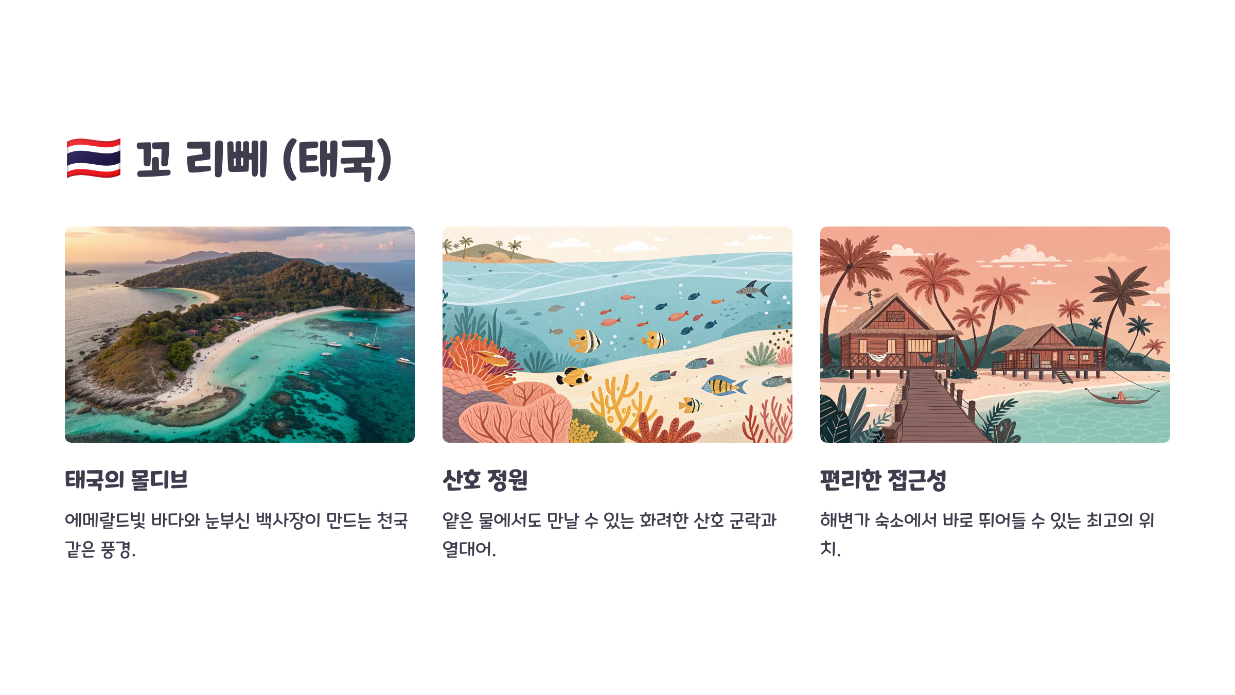 태국 남부 안다만 해, 말레이시아 국경 근처에 위치한 작은 섬 꼬 리뻬(Koh Lipe)는 '태국의 몰디브'라는 별명이 붙을 만큼 투명한 에메랄드빛 바닷물과 새하얀 백사장, 그리고 무엇보다 **놀랍도록 건강하고 다채로운 산호초**로 유명한 곳입니다. 아직 다른 유명 섬들에 비해 덜 알려져 비교적 때 묻지 않은 자연을 만끽할 수 있습니다.