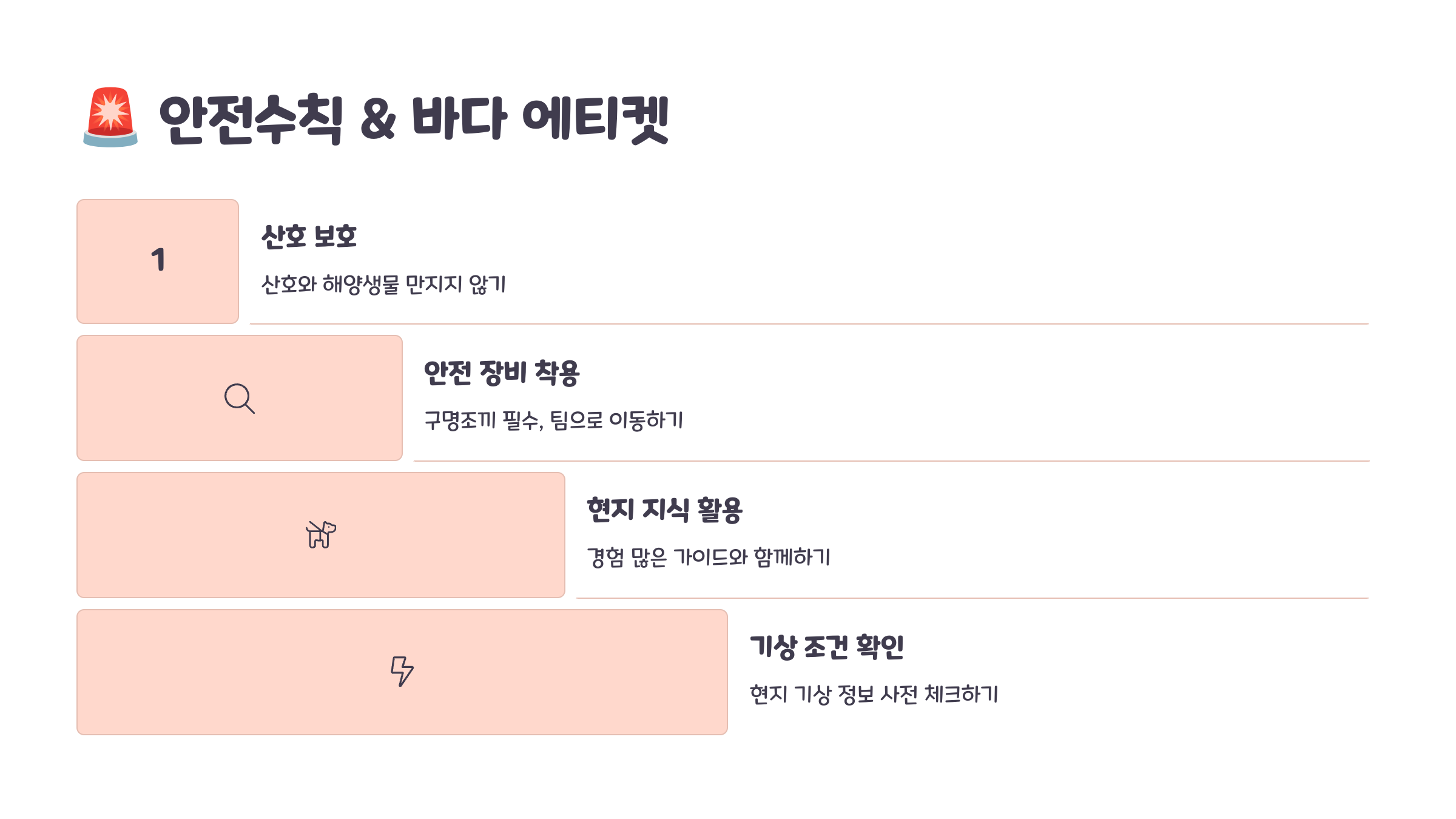 - 해양 생물 존중하기: 아름다운 물고기와 산호초는 눈으로만 감상해주세요. 만지거나 밟는 행위는 해양 생태계를 훼손하고 자신에게도 위험할 수 있습니다.