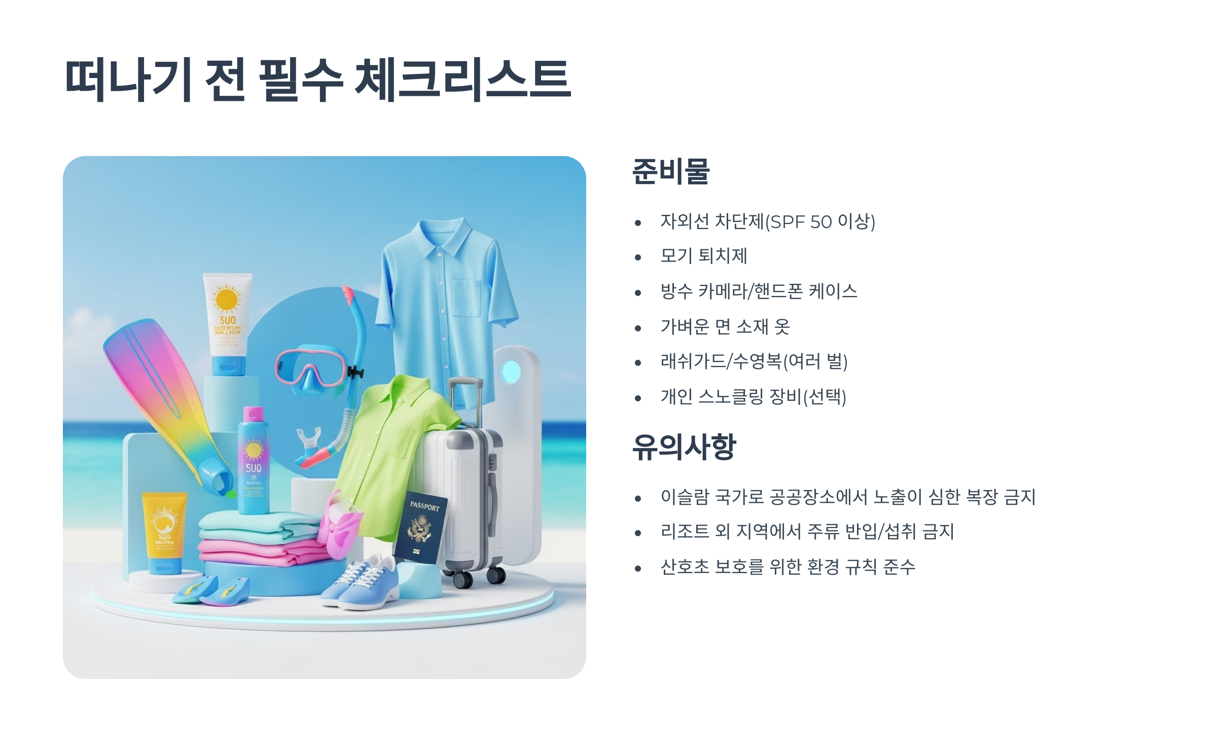 👇 완벽한 몰디브 여행을 위한 필수 준비물과 유의사항을 살펴봅니다.
