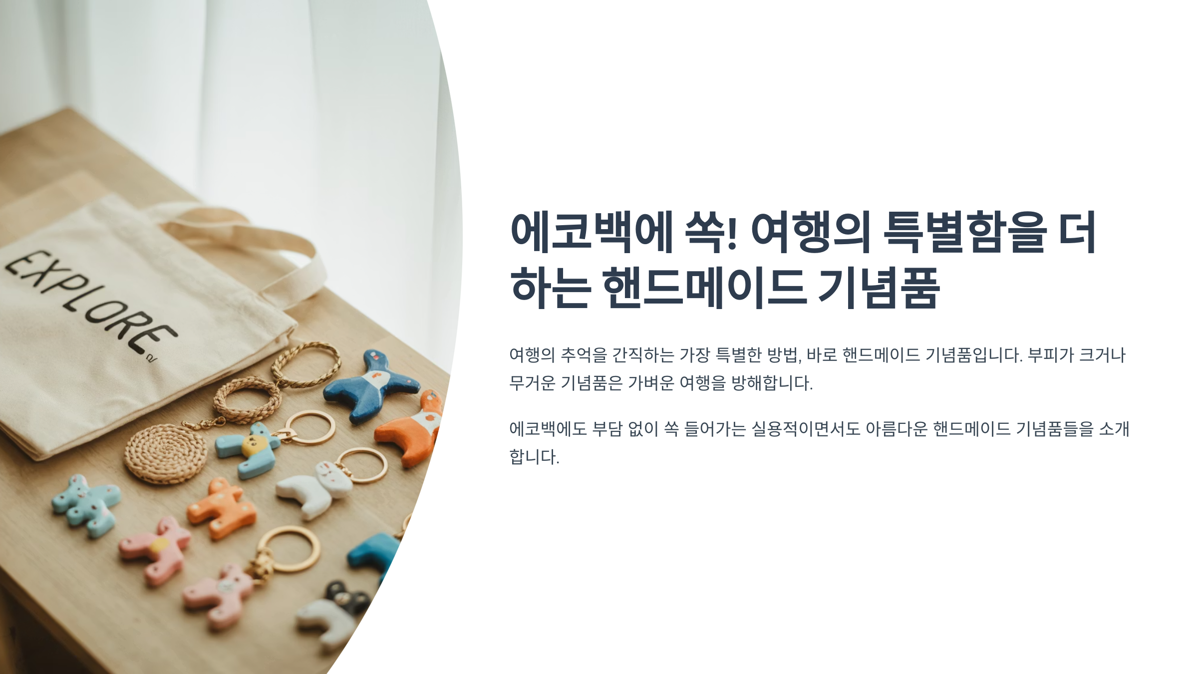핸드메이드 기념품은 여행의 소중한 순간을 담는 작은 보석과 같습니다. 에코백에 쏙 들어가는 가볍고 특별한 아이템으로 여러분의 여행을 더욱 풍요롭게 만들어보세요!
