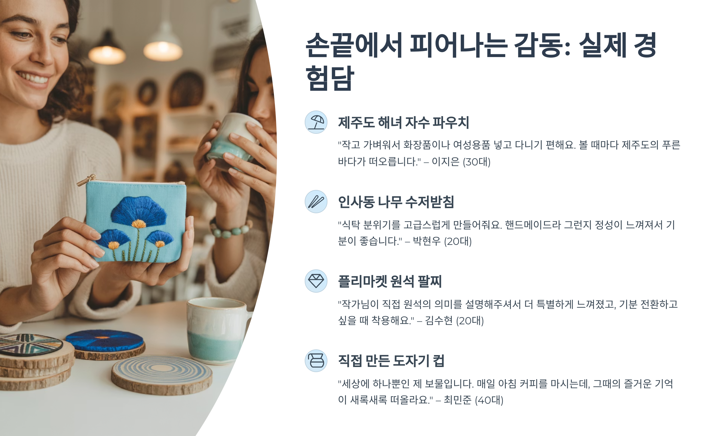 “제주도 여행에서 구매한 해녀 자수 파우치, 작고 가벼워서 화장품이나 여성용품 넣고 다니기 정말 편해요. 볼 때마다 제주도의 푸른 바다가 떠오릅니다.” – 이지은 (직장인, 30대)