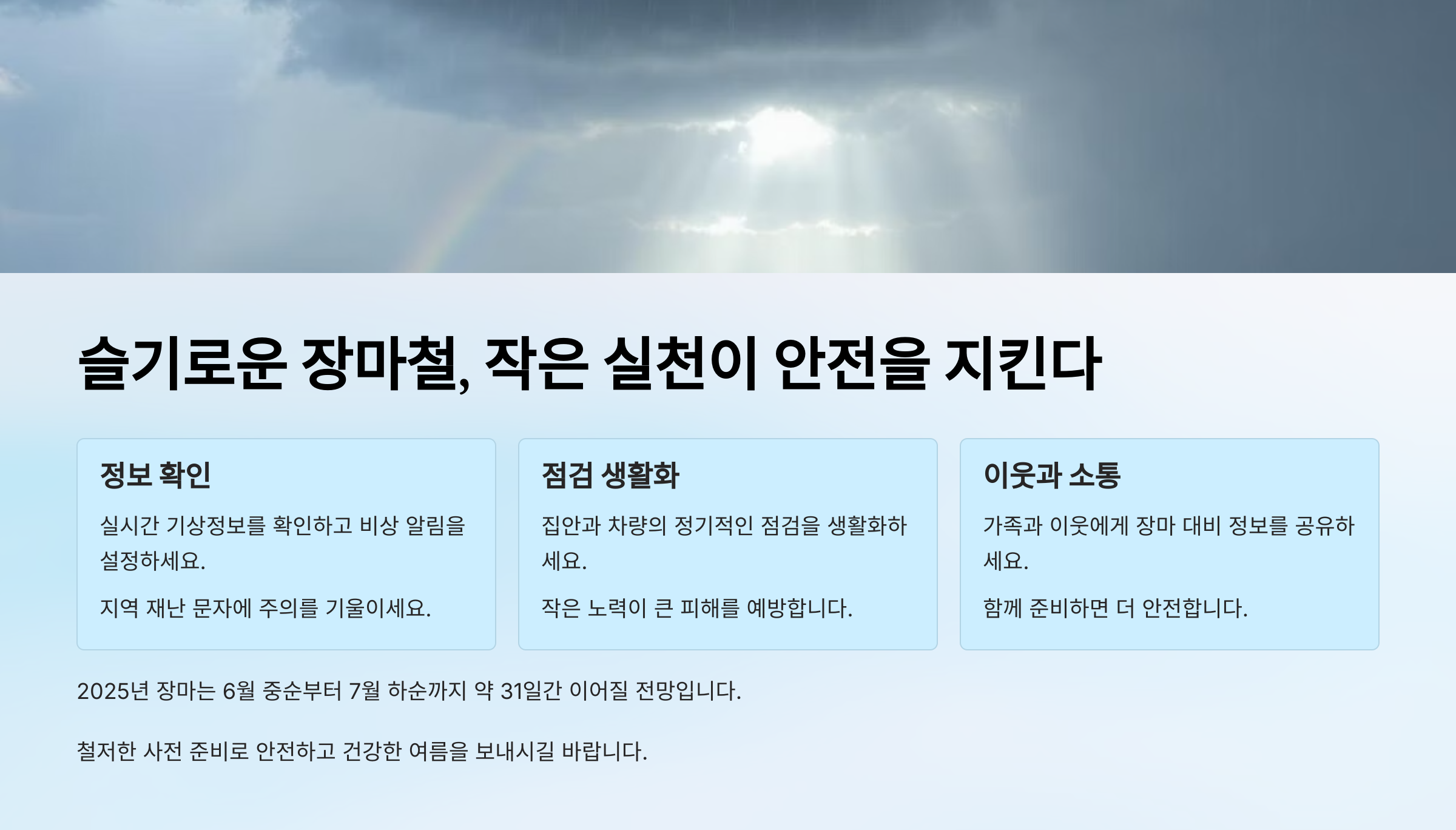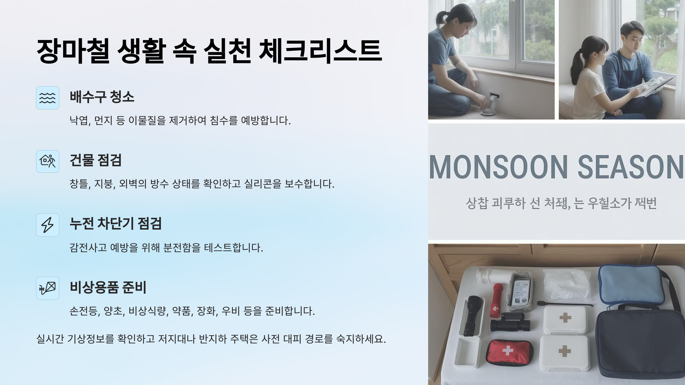배수구 청소, 방수 점검, 기상정보 확인 등 작은 준비만으로도 안전한 여름을 보낼 수 있습니다.