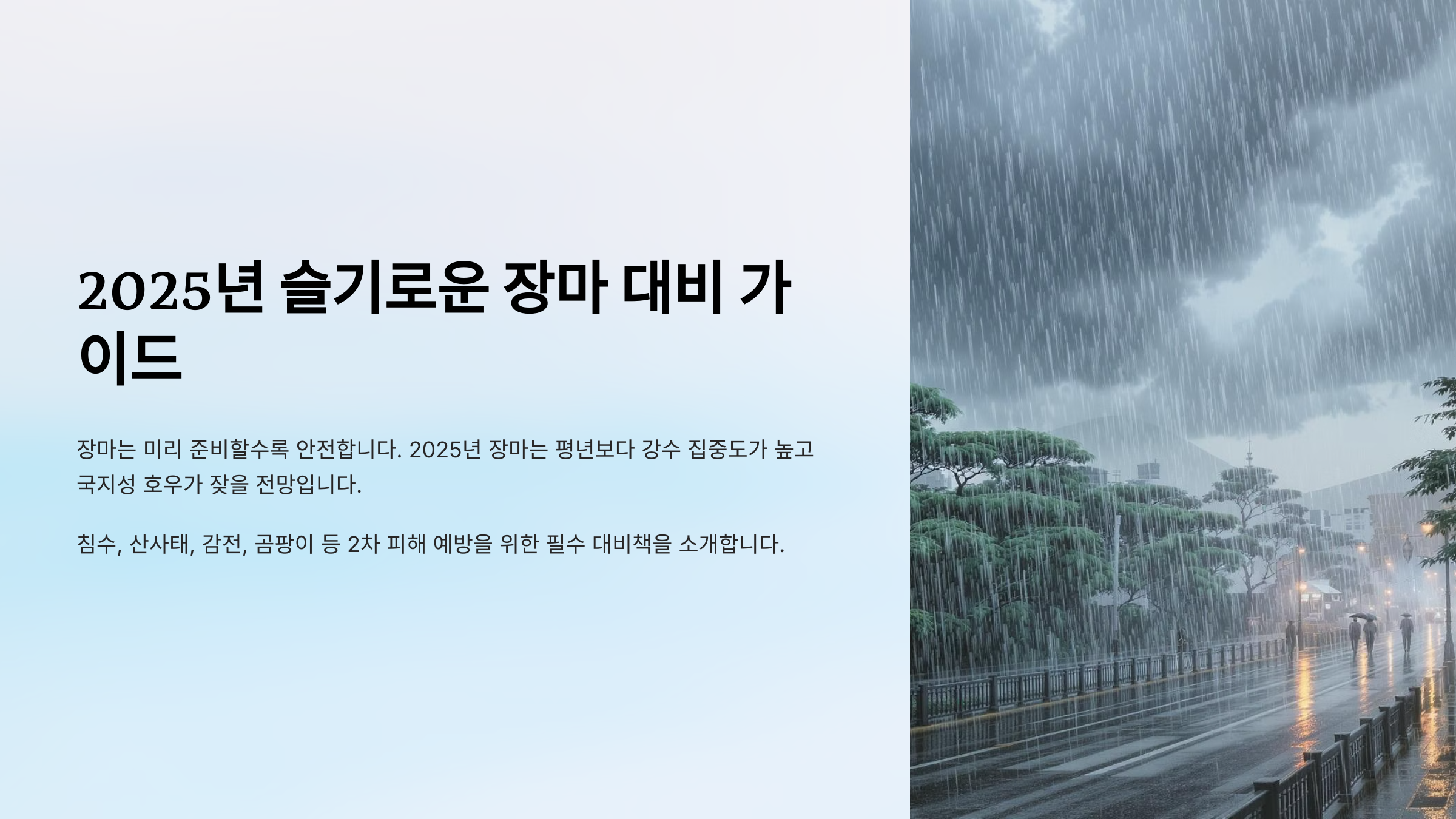 올해는 특히 침수, 산사태, 감전, 곰팡이 등 2차 피해 예방이 중요하므로, 생활 속 실천과 대비가 필수입니다.