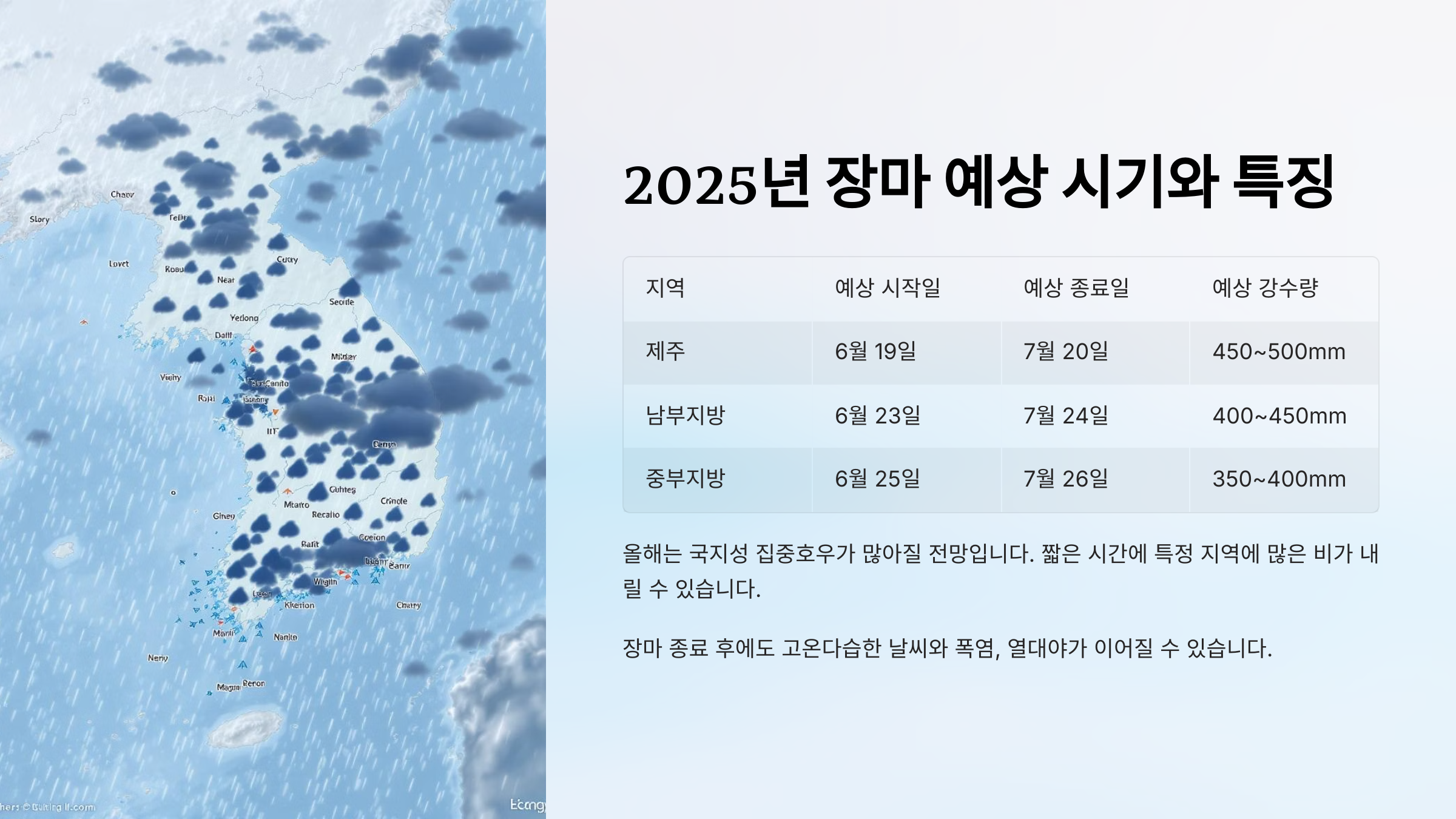 2025년 장마는 예년과 비슷한 시기에 시작되지만, 강수 집중도가 높고 예측이 어려운 국지성 호우가 잦을 전망입니다.