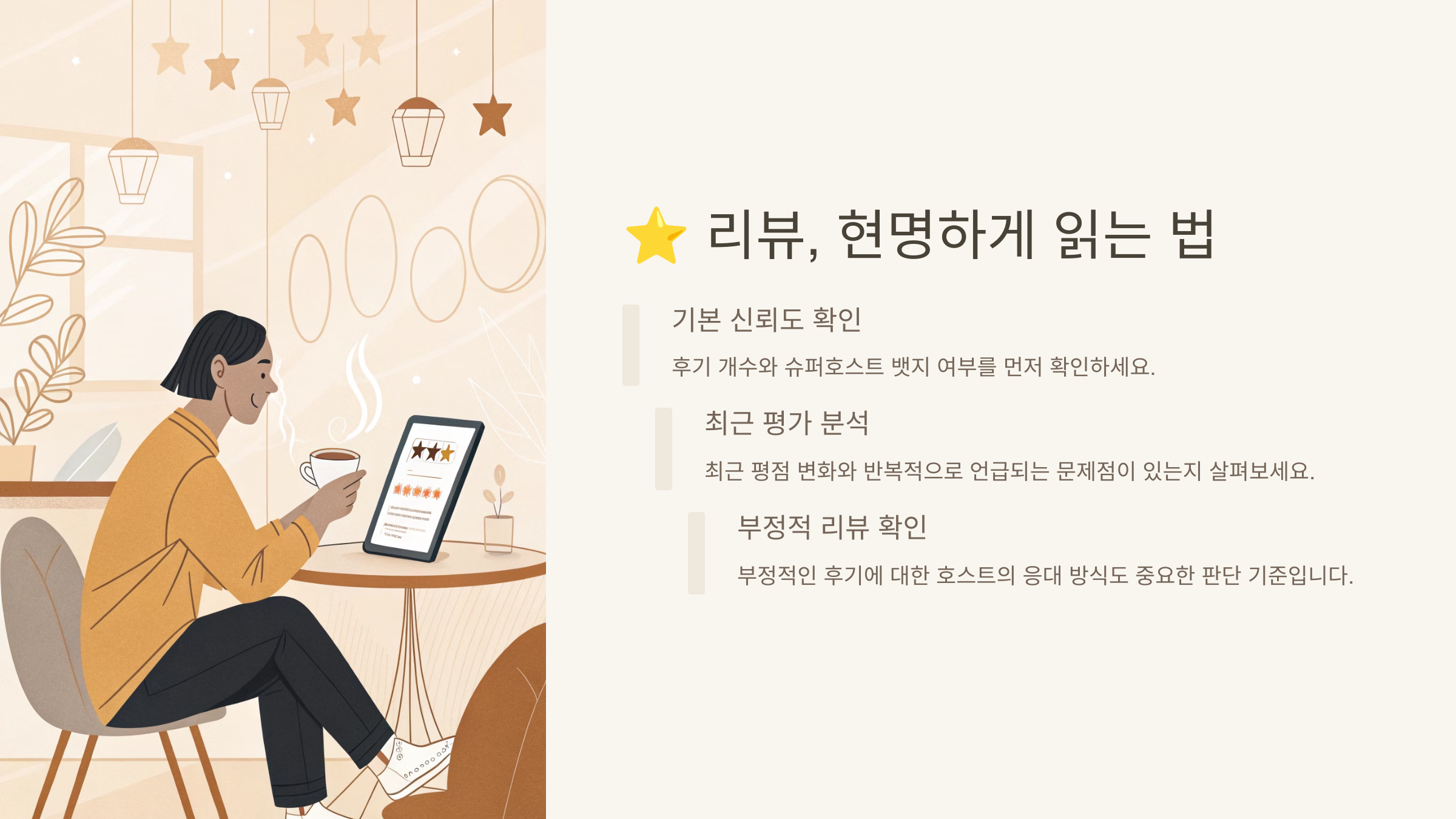 숙소 사진과 설명만으로는 알 수 없는 **실제 경험**을 파악하는 데 가장 중요한 정보는 바로 **다른 게스트들이 남긴 리뷰(후기)**입니다. 리뷰를 현명하게 읽는 것은 후회 없는 숙소 선택의 핵심입니다.